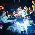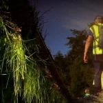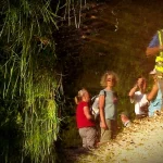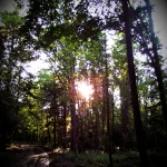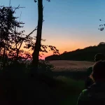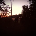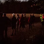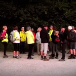 La nuit tombe tout doucement. Petit à petit nos yeux s’habituent à l’assombrissement. Dans l’obscurité naissante nous tirons parti de ce qu’il reste de la lumière pour nous équiper pour la marche nocturne. À 22h 30 l’instant est idéal pour partir à l’aventure nocturne. Une promenade envoûtante nous attend. C’est donc tout naturellement qu’Alain propose au groupe de partir marcher dans la forêt pour éprouver la vie palpitante de la nuit.