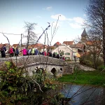 Notre périple de presque 14 kms s’achève après la traversée de Dommarien. Notre groupe prend alors la pause sur le pont enjambant la Vingeanne, dans l’attente du passage d’une péniche peut-être, ou alors d’un gros poisson remontant la rivière… Nous sommes le 1er avril !!!