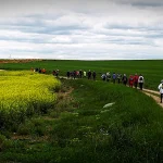 Sur le plateau, nous traversons une vaste plaine agricole. Le ciel est nuageux et l’air reste frais pour la saison. Les conditions anticycloniques engendrent un temps sec et une bise de nord-est soutenue.