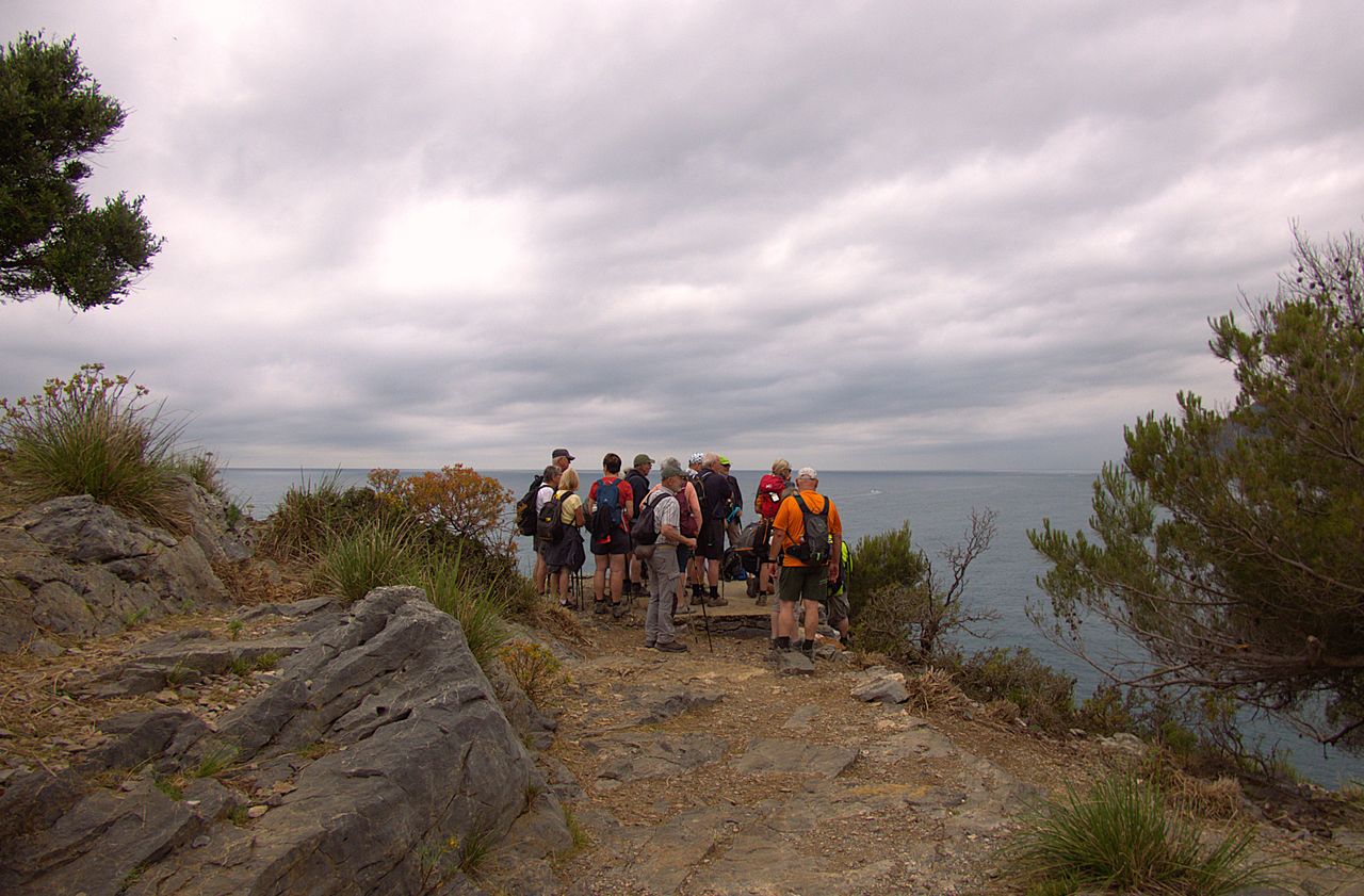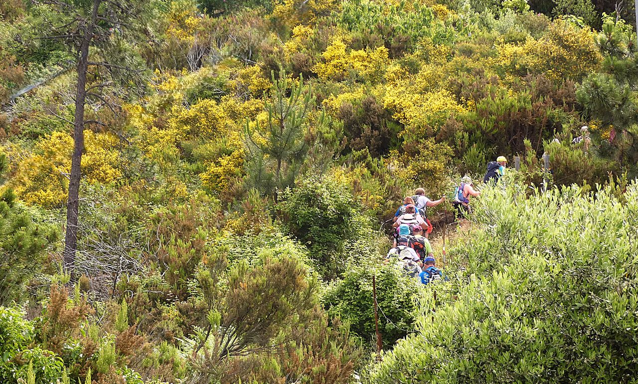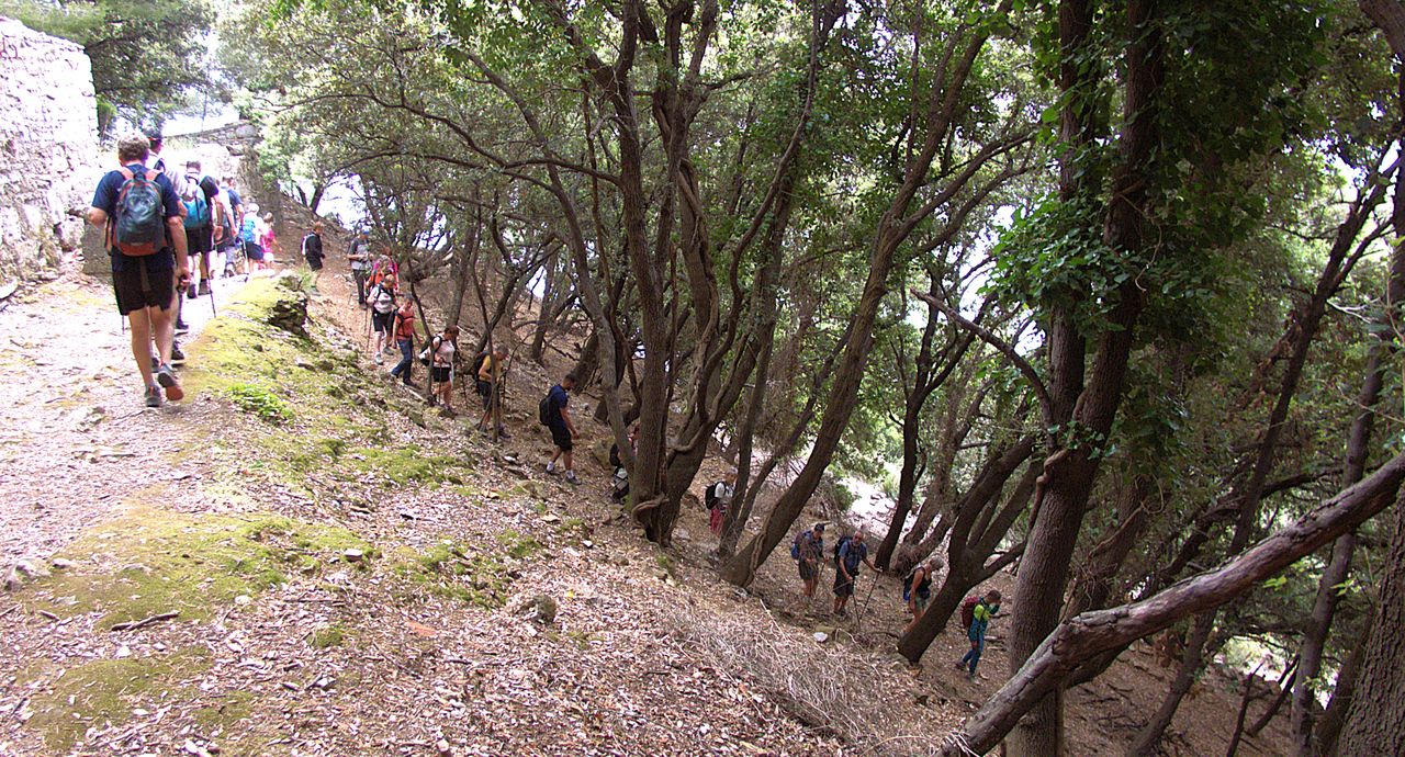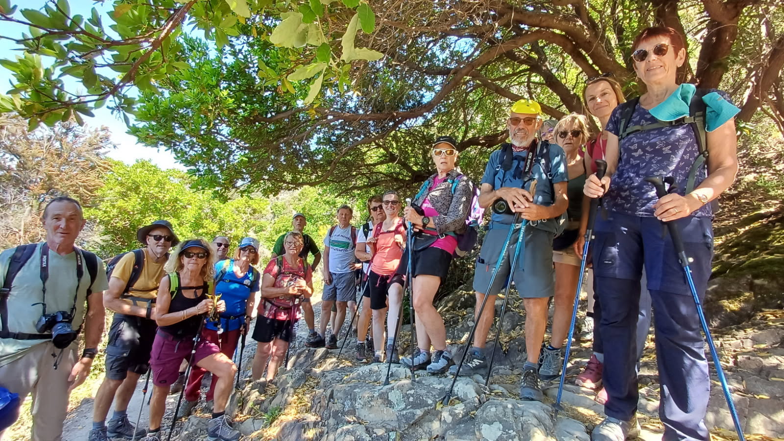 Après avoir sillonné les petites rues du village nous prenons de la hauteur pour admirer le panorama, la progression se fait sur un terrain escarpé où certains souffrent un peu mais le rythme est adapté à l’ensemble du groupe. Chacun comprend que nous ne sommes pas sur notre plateau de Langres avec l’objectif d’avaler des kilomètres, dans notre situation il est impératif d’atteindre le sommet. Nous cheminons entre des murs de pierres sèches élevés par les Génois au 12ème Siècle et qui sont encore en place et le maquis de chênes verts. Nous découvrons les terrasses où la vigne était une des principales cultures. L’accès aux terrasses ne peut se faire qu’à pied, l’accès des engins est impossible. C’est à ce moment là où l’on mesure toute la difficulté pour entretenir les terrains et redescendre les récoltes aux villages.