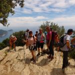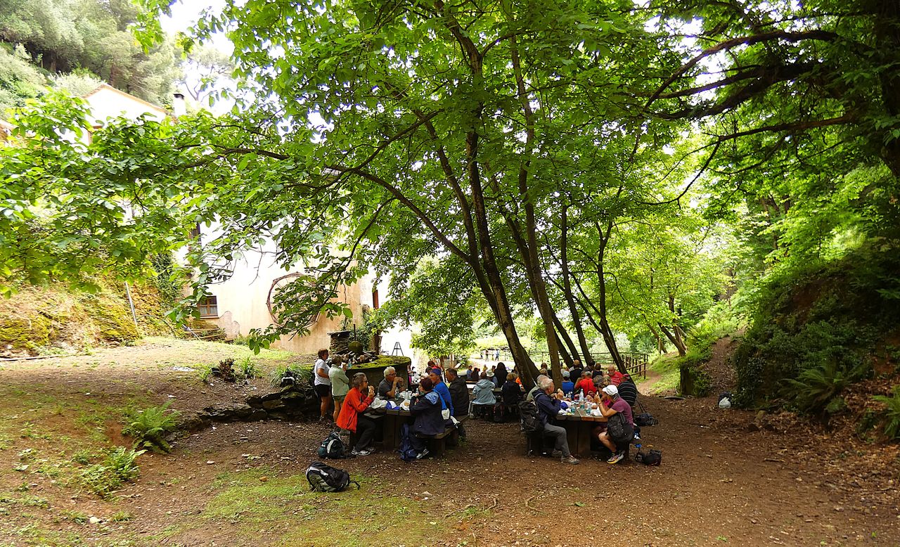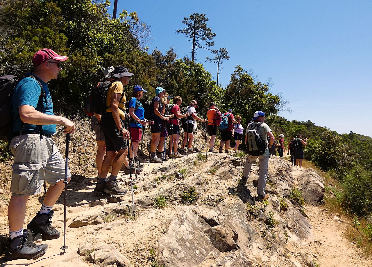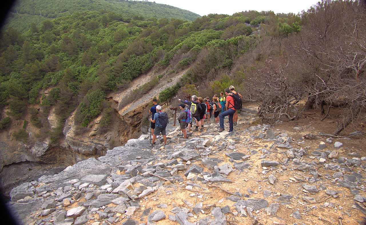 Après avoir sillonné les petites rues du village nous prenons de la hauteur pour admirer le panorama, la progression se fait sur un terrain escarpé où certains souffrent un peu mais le rythme est adapté à l’ensemble du groupe. Chacun comprend que nous ne sommes pas sur notre plateau de Langres avec l’objectif d’avaler des kilomètres, dans notre situation il est impératif d’atteindre le sommet. Nous cheminons entre des murs de pierres sèches élevés par les Génois au 12ème Siècle et qui sont encore en place et le maquis de chênes verts. Nous découvrons les terrasses où la vigne était une des principales cultures. L’accès aux terrasses ne peut se faire qu’à pied, l’accès des engins est impossible. C’est à ce moment là où l’on mesure toute la difficulté pour entretenir les terrains et redescendre les récoltes aux villages.