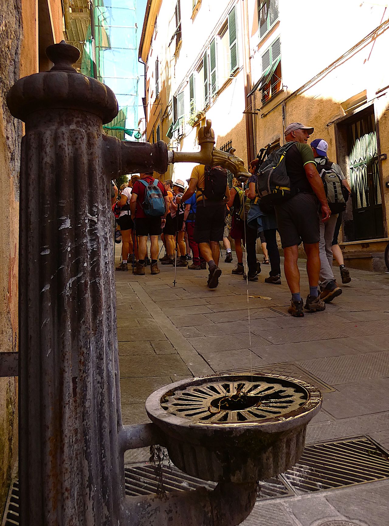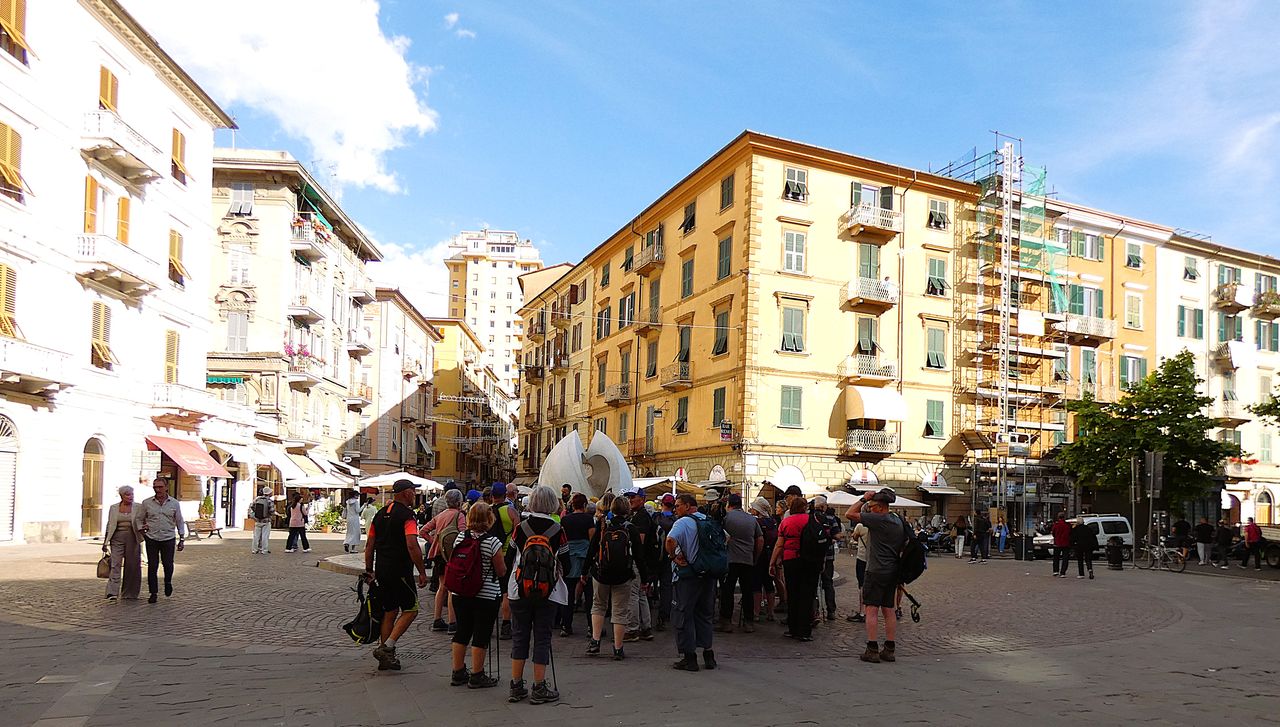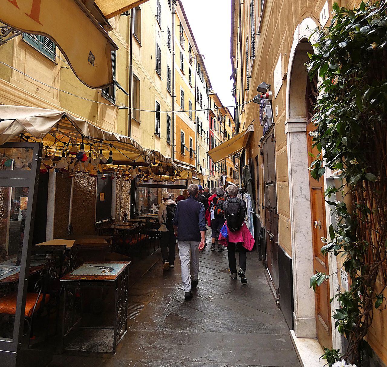 L’orage est venu jouer les trouble-fête ce matin et impose un changement de programme pour la sécurité de tous, étant donné le risque de chutes sur les roches. Le choix retenu par nos guides et de faire une visite de Recco haut lieu de la gastronomie et renommé pour la « Foccacia di Recco » : le plat se compose d’une très fine couche de pâte à pain non levée sur laquelle on dépose du « Stracchino » fromage frais et crémeux ensuite on dépose dessus une fine couche de pâte à pain et cuisson ensuite. Pour ses pates faites à la main, la po cacha, farine de châtaigne, etc…