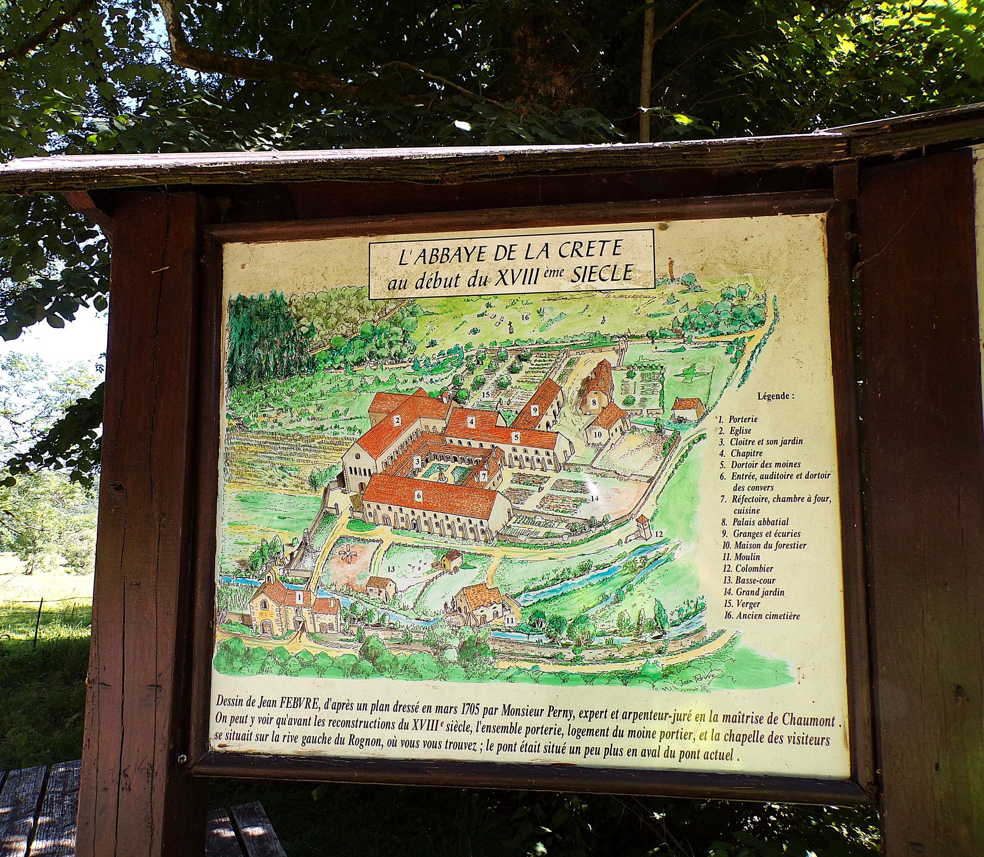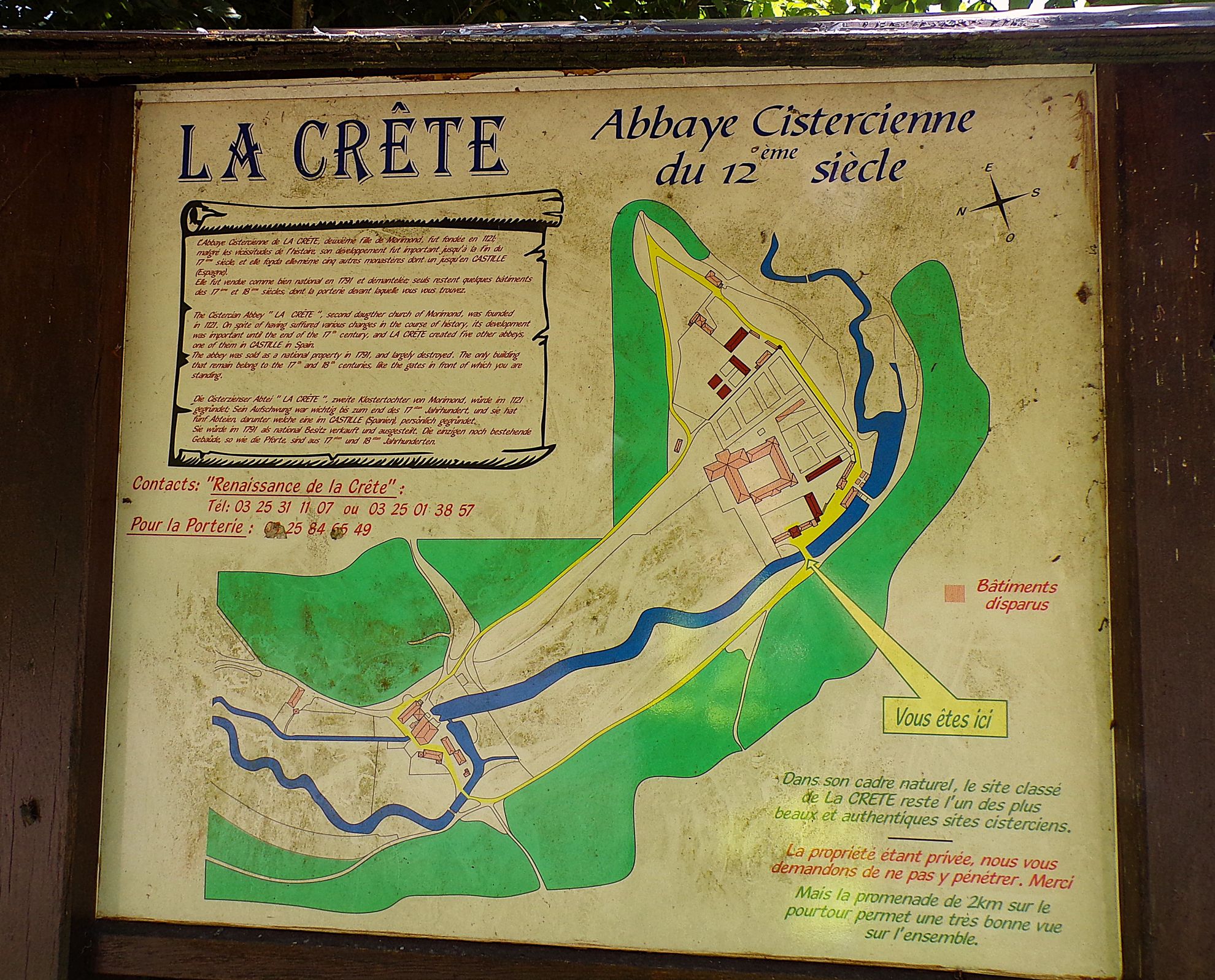 Au XIe siècle, il existe déjà au lieu-dit « la Vieille Crête » un bâtiment qui avait été remis à l’ordre de Cîteaux. Un groupe de moines cisterciens, parti de Morimond, en prit possession vers 1118, mais ils trouvèrent le site peu favorable au développement d’un monastère et décidèrent alors de faire appel à la piété des seigneurs du pays pour construire une nouvelle abbaye, à quelques centaines de mètres en aval de la Vieille Crête. C’est en effet le seigneur de Clefmont, Simon II, qui offrit le site au bord de la petite rivière du Rognon, aux moines de Morimond – site conforme au modèle cistercien : un site sauvage, à l’écart du monde, du commerce des hommes et à proximité d’une rivière pour assurer l’autonomie complète du site. Celui de La Crête est certainement l’un des plus beaux du monde cistercien et on peut ainsi rejoindre Jean-François Leroux : « le paysage de la Haute-Marne profonde semble intrinsèquement cistercien et on peut rêver d’un itinéraire de redécouverte de tous ces hauts lieux médiévaux ; ceux qui le suivront seront hors du temps. »[7]