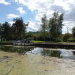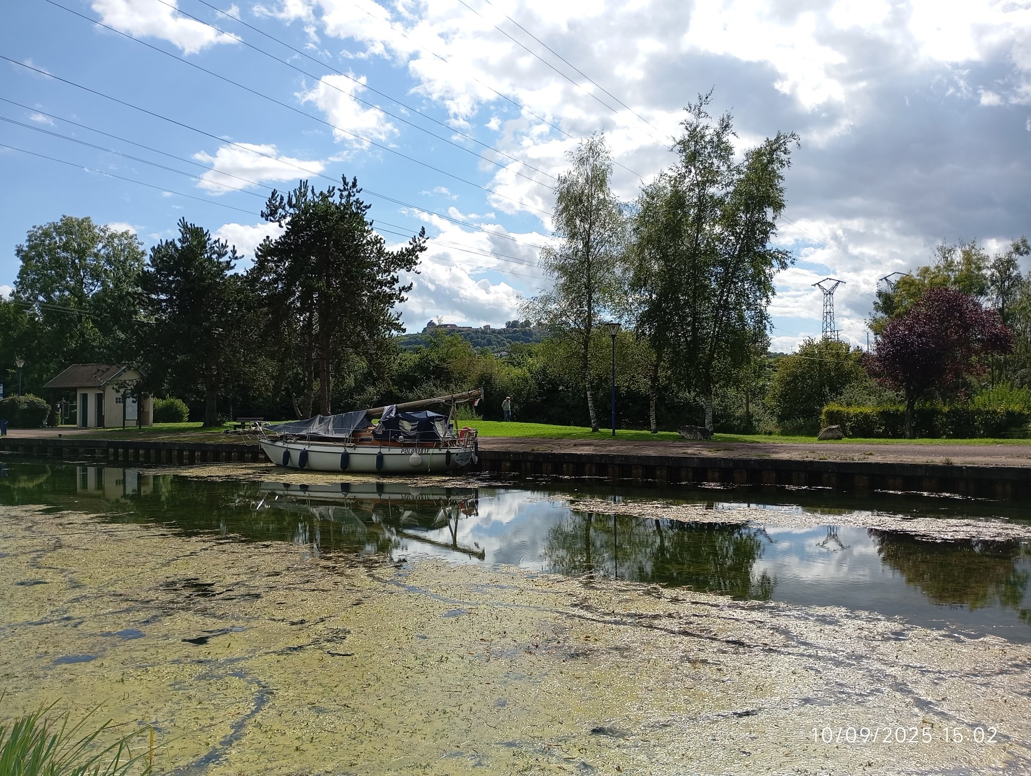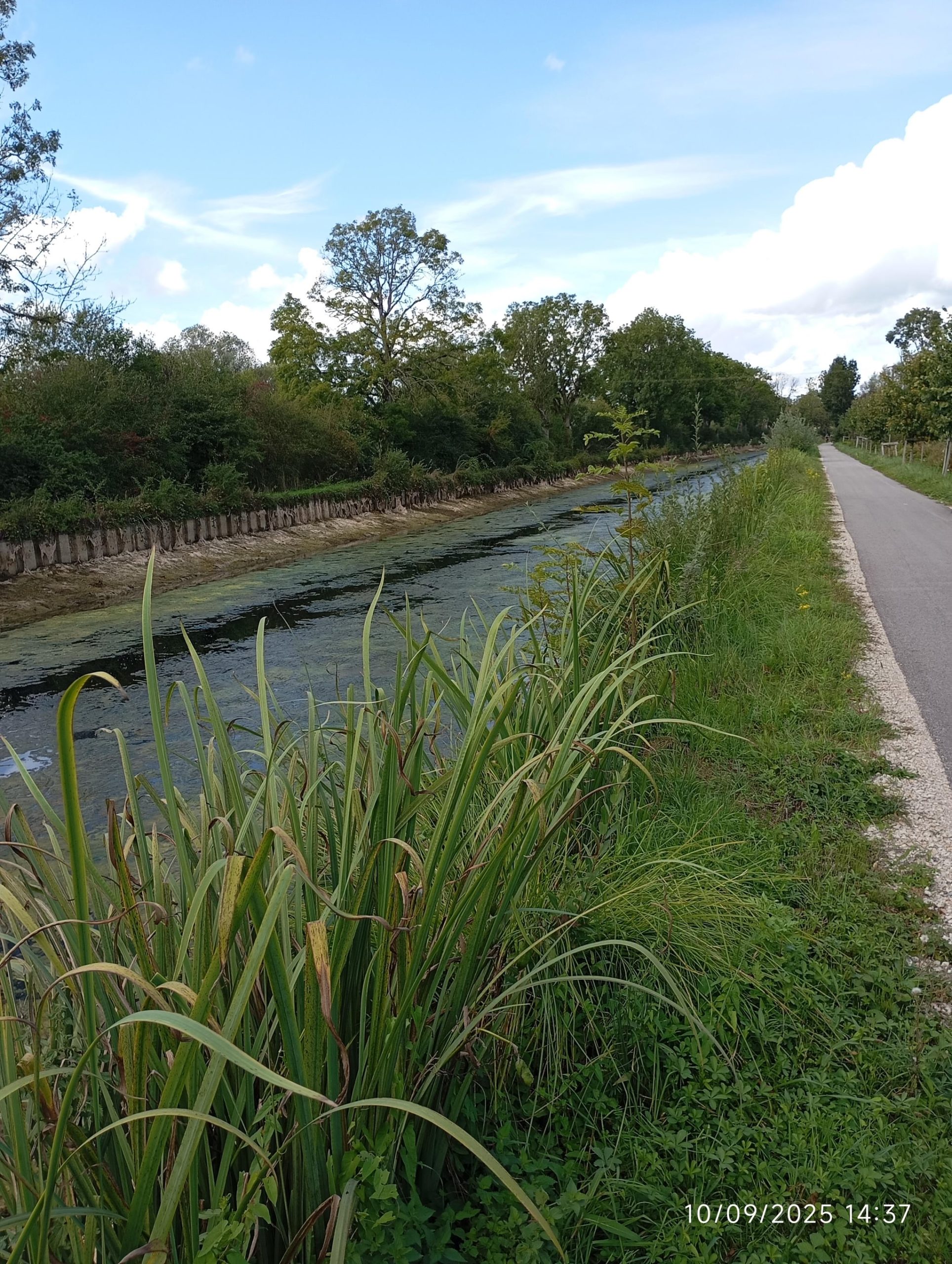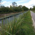 Notre GPS nous guide en direction du canal malheureusement presque à sec depuis sa mise en chômage technique suite à la sécheresse.