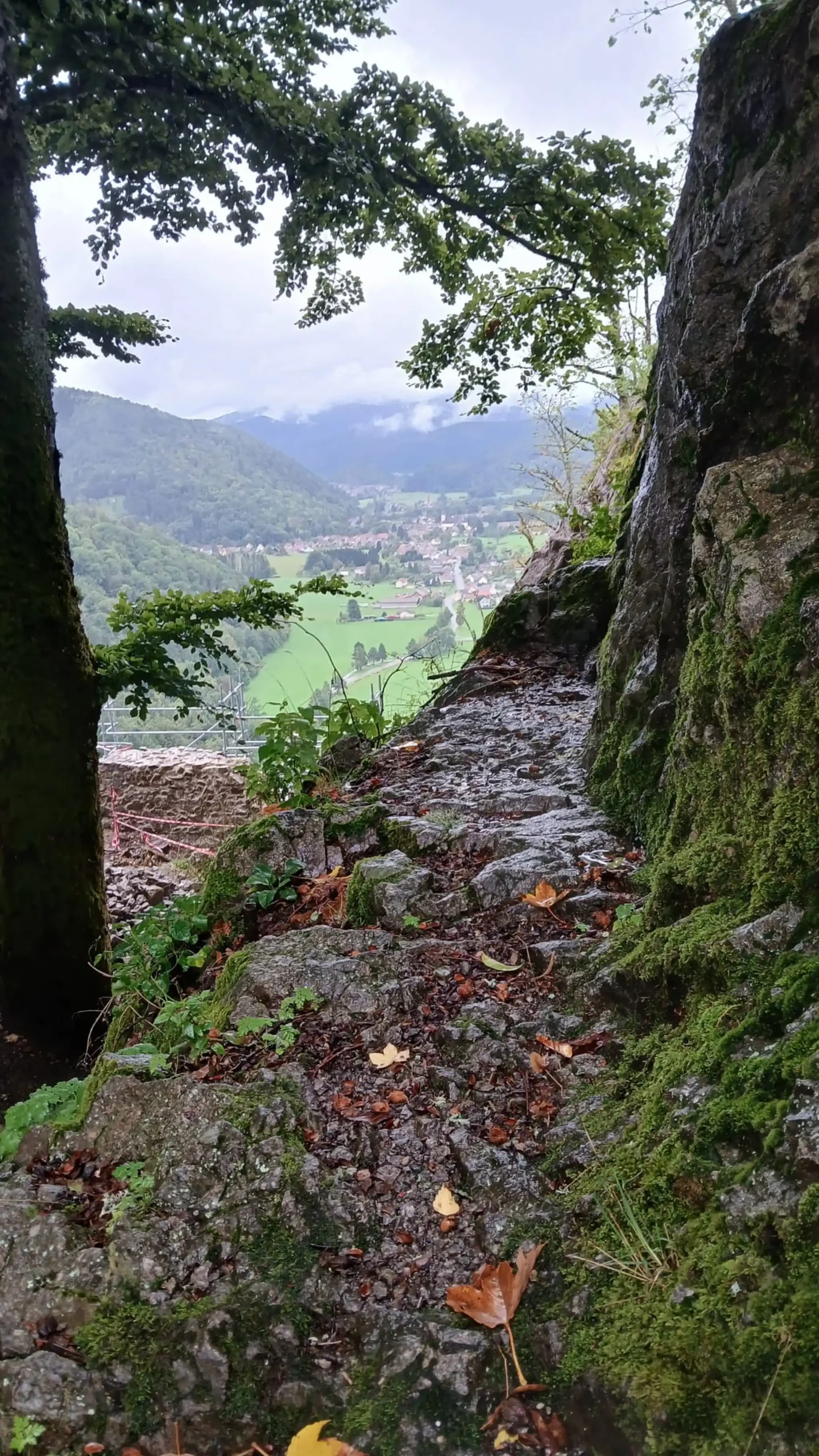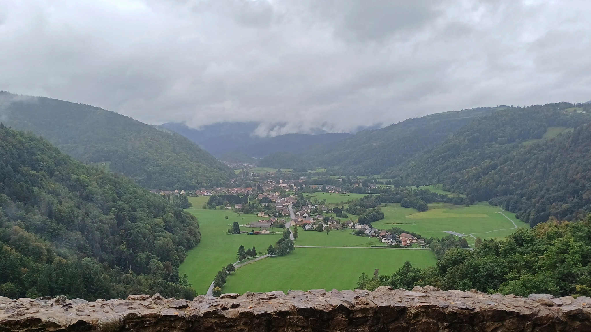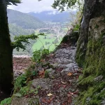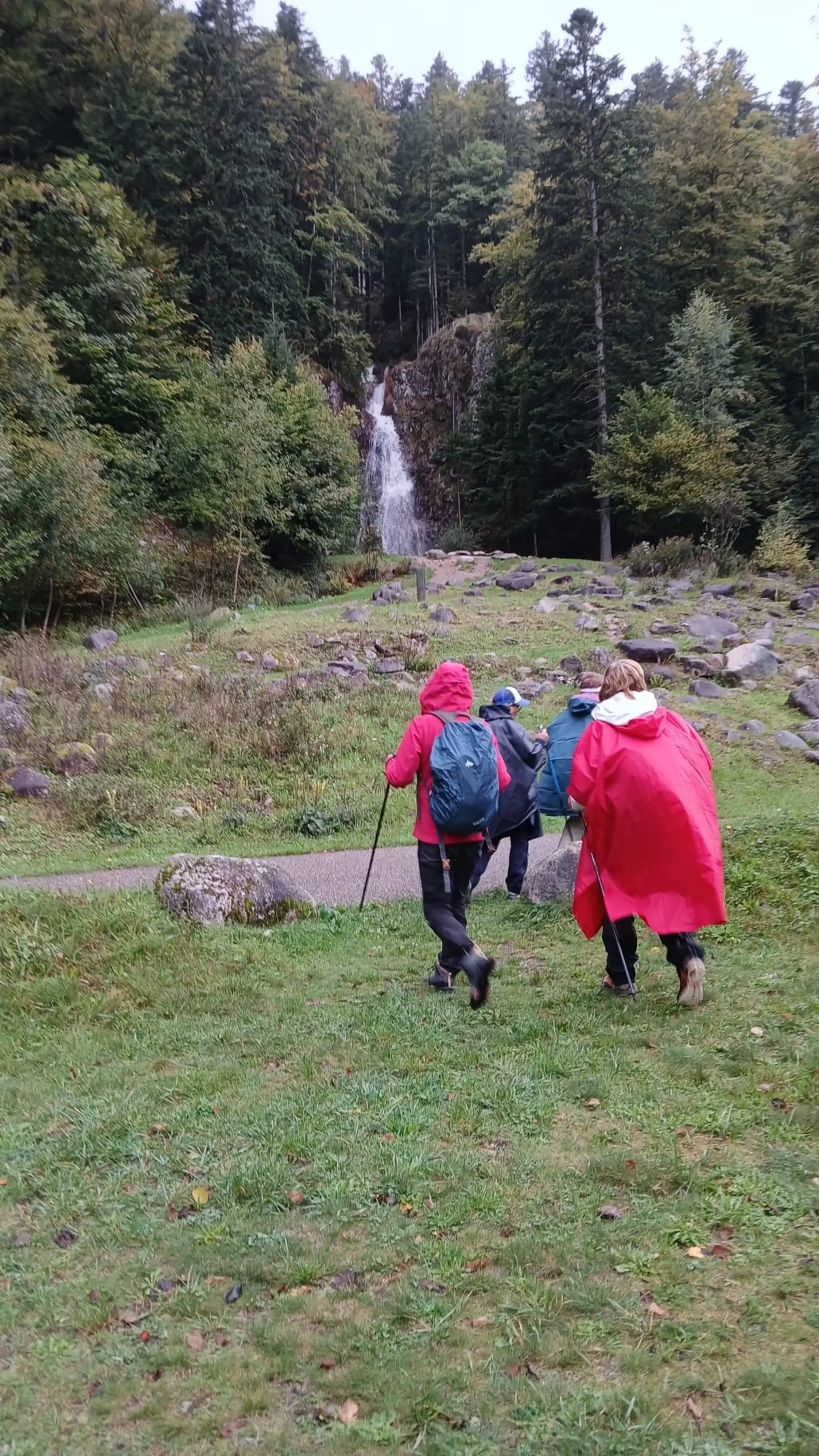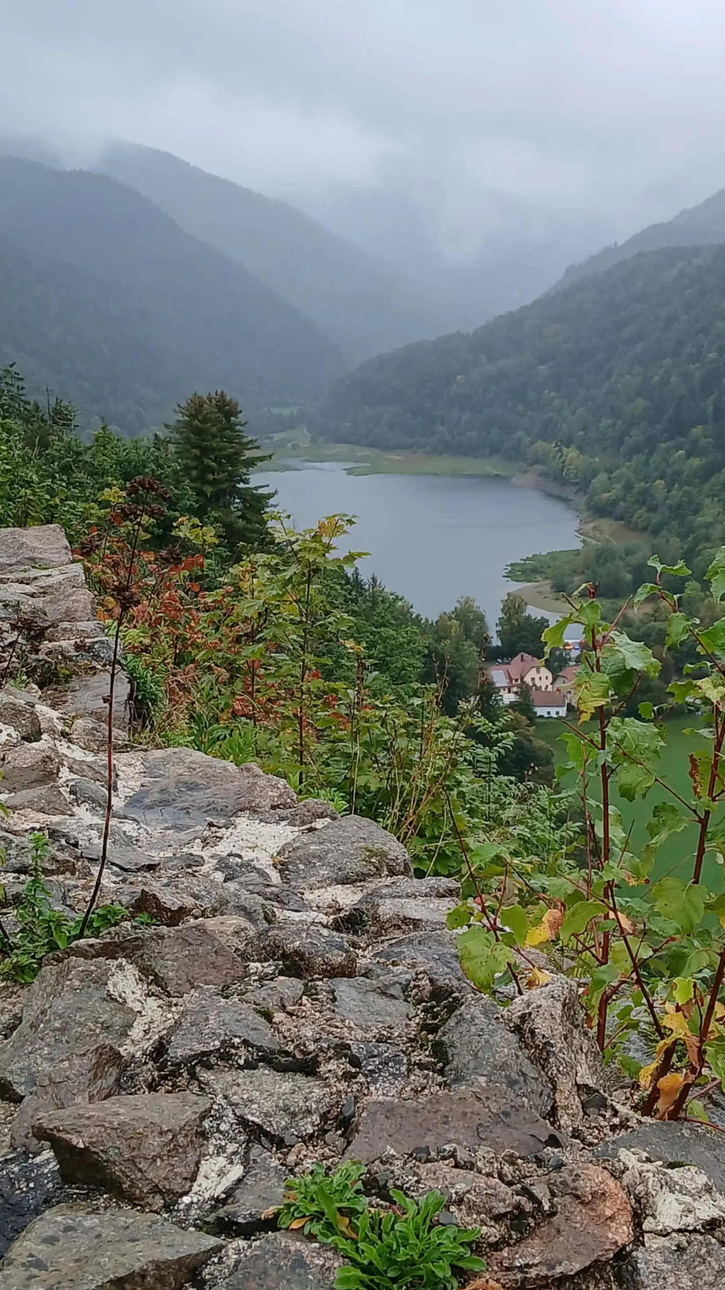 • Jour 1 : lac de Kruth et château de Wildenstein au Schossberg : À peine arrivé à destination, direction le chalet des places pour un pique-nique « au sec » avant de se rendre au bord du lac de Kruth pour une première randonnée. Les premiers paysages, même sous la brume, nous ont rappelé la beauté sauvage de cette région. Une bonne grimpette le long de la cascade du Bockloch pour se mettre en condition, ensuite un long sentier nous ramenant vers le barrage du lac pour ensuite grimper et découvrir les ruines du château de Wildenstein datant du 14ᵉ siècle. Le tout avec une météo contrastée entre nuages et averses « conséquentes ». Pas suffisant pour rafraîchir nos ardeurs et anticiper la randonnée du jour suivant devant un bon repas.