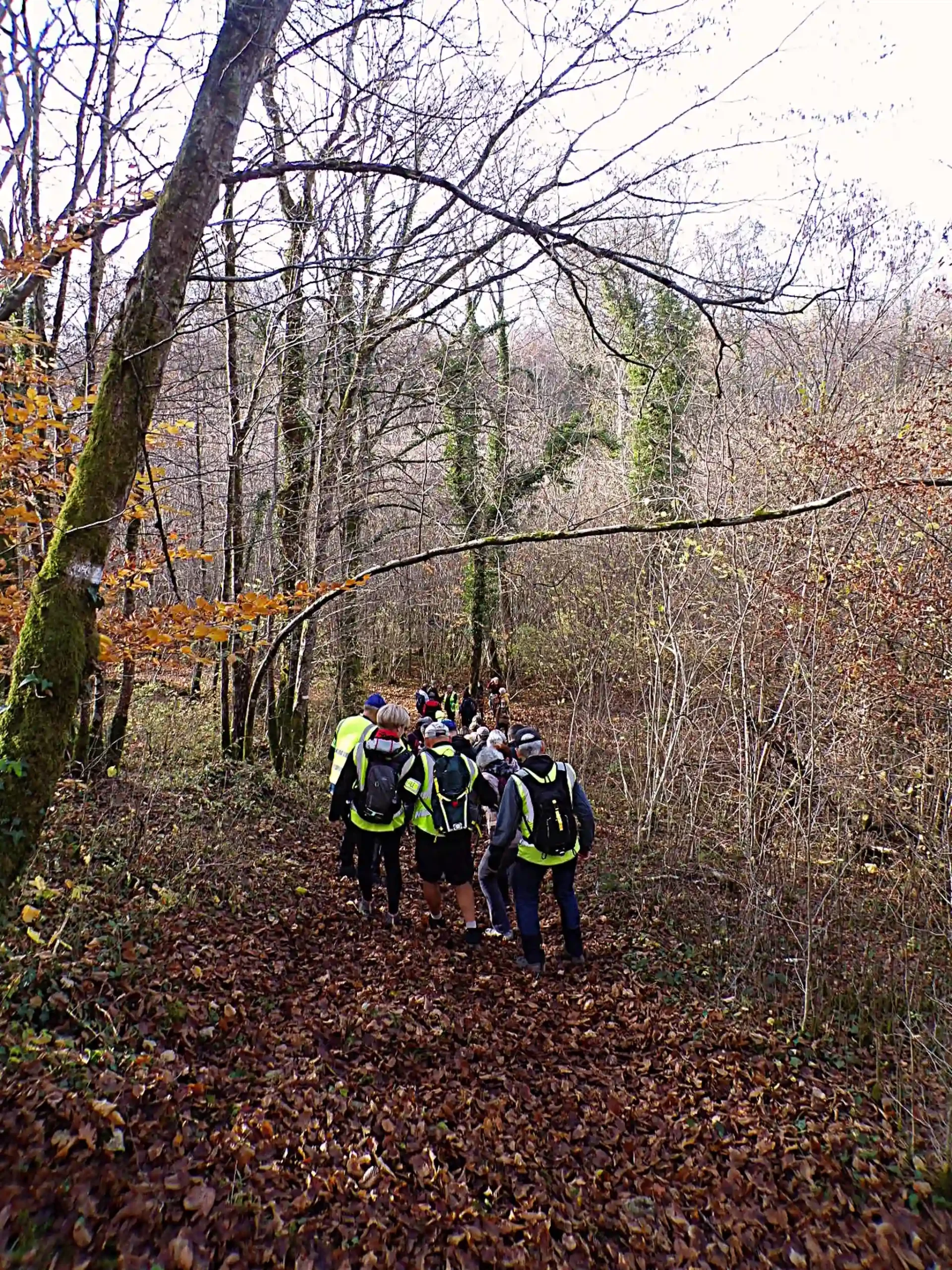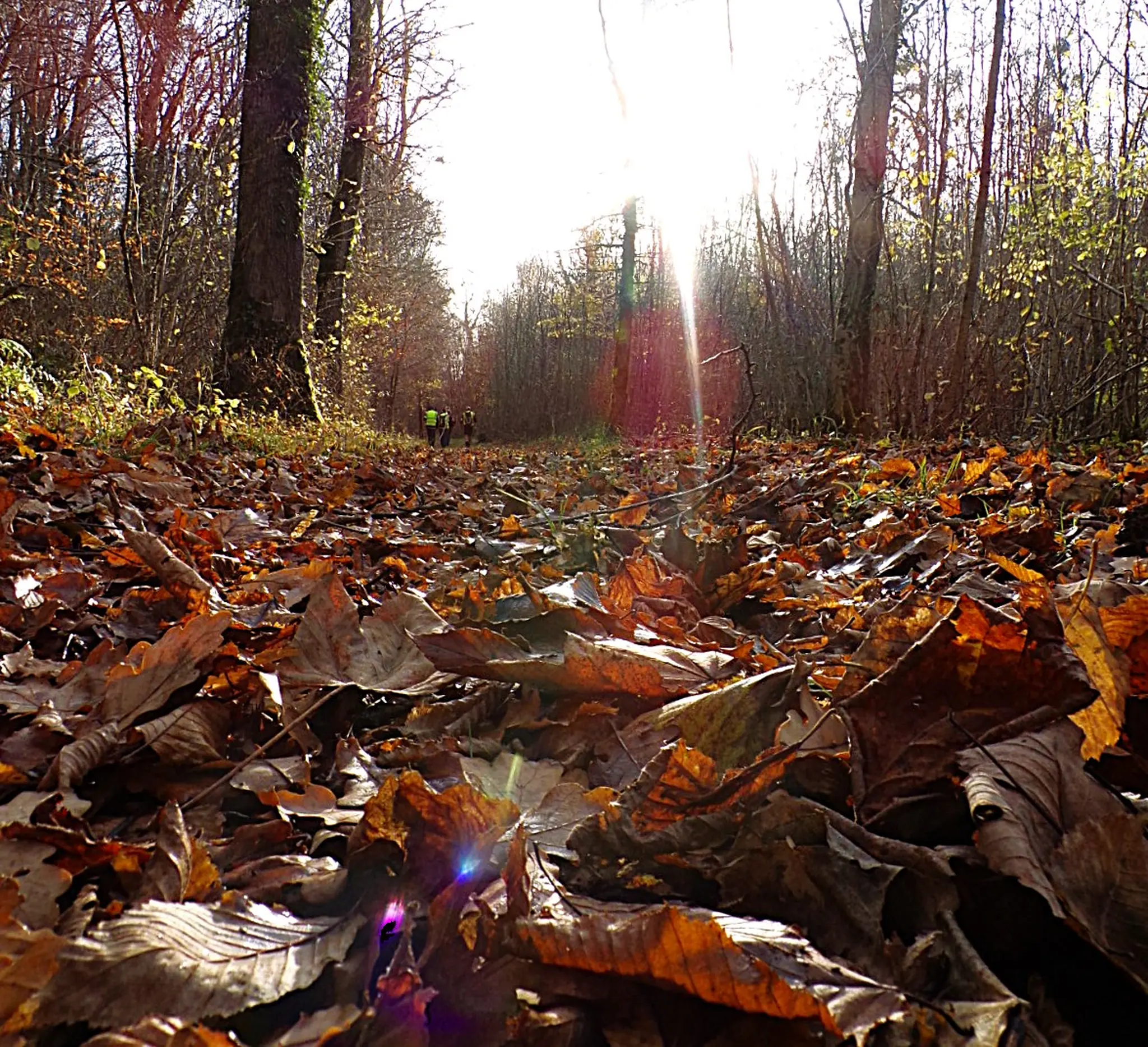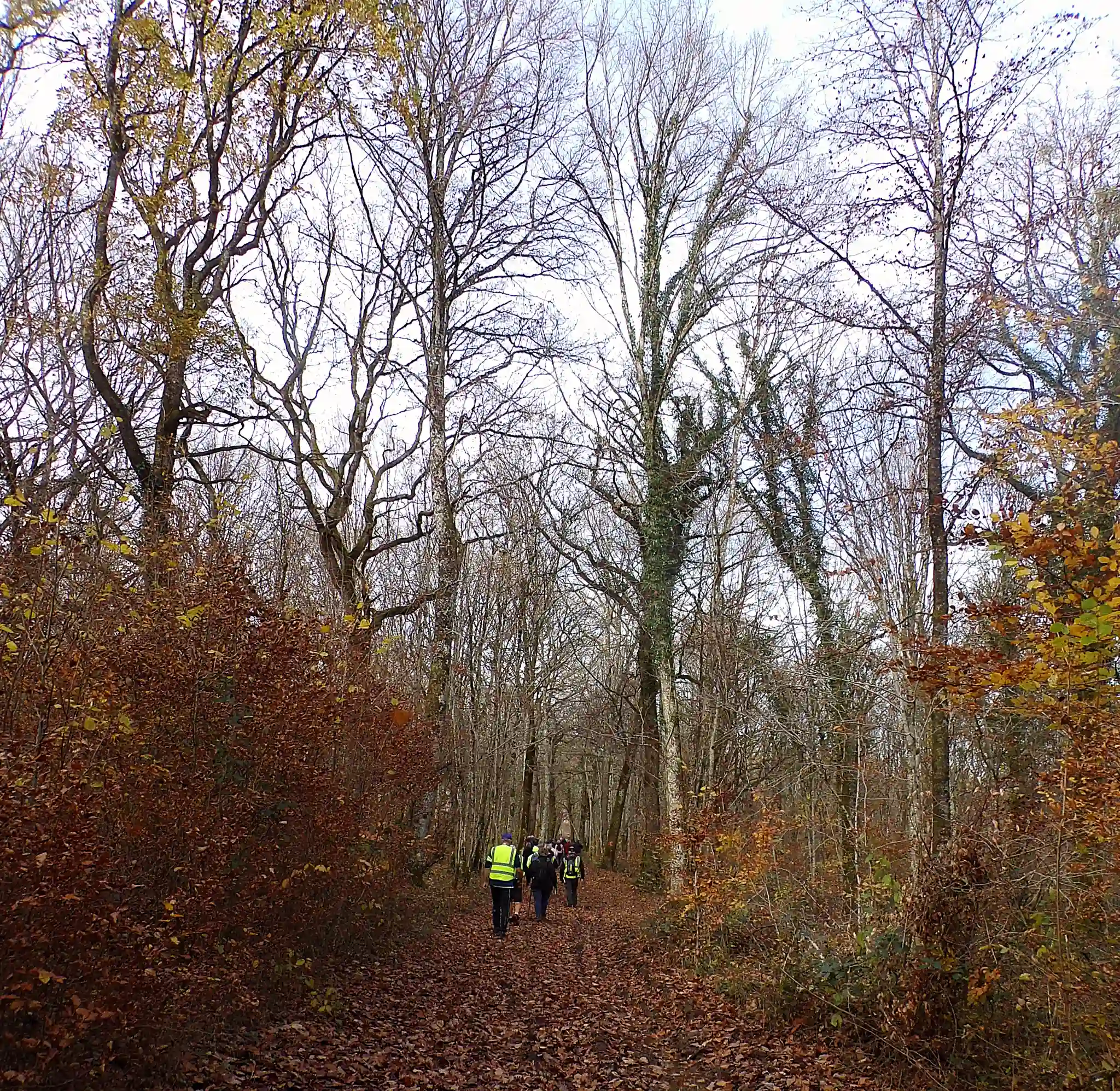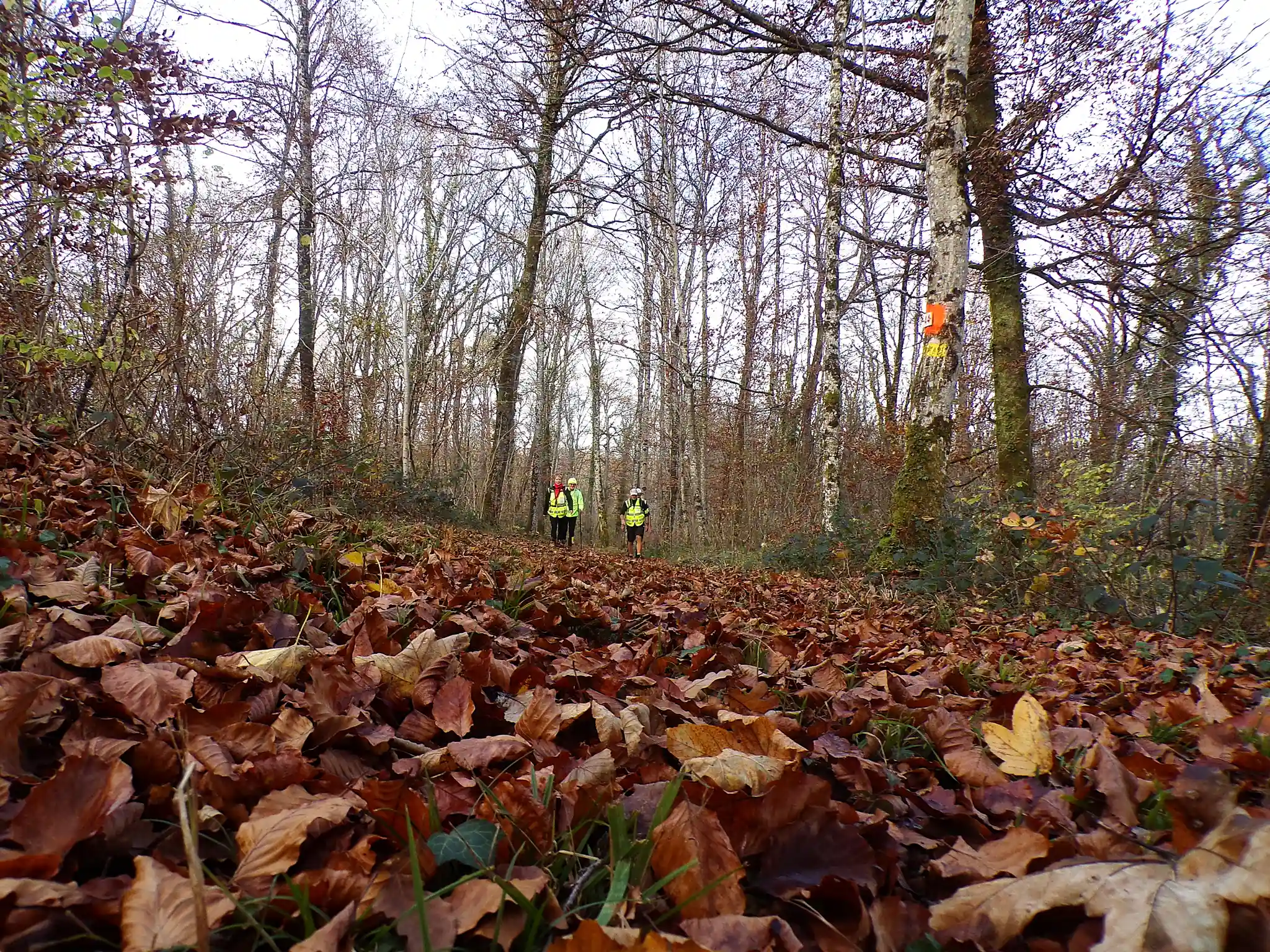 Aujourd’hui nous nous déplaçons sur un tapis de feuilles, qui amorti le ressenti sur le sol mais cache les roches de surface et peut entraîner des chutes, la prudence de chacun a évité les chutes seules quelques embardées dans les passages humides ont mis en évidence des zones humides.
