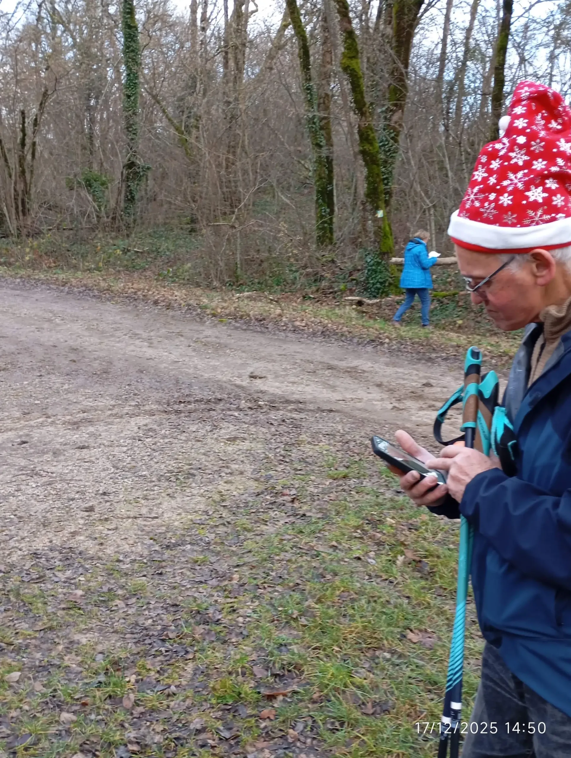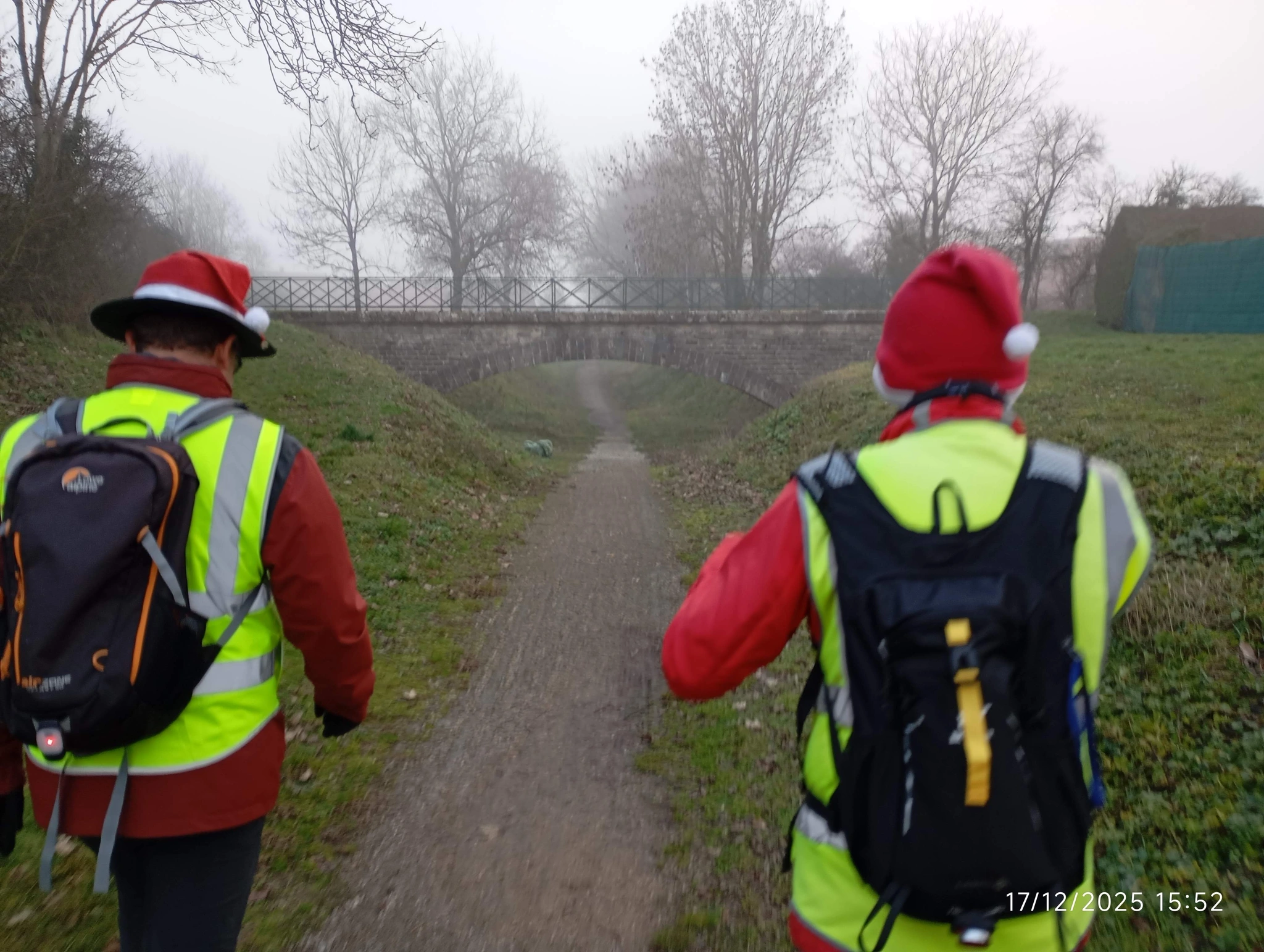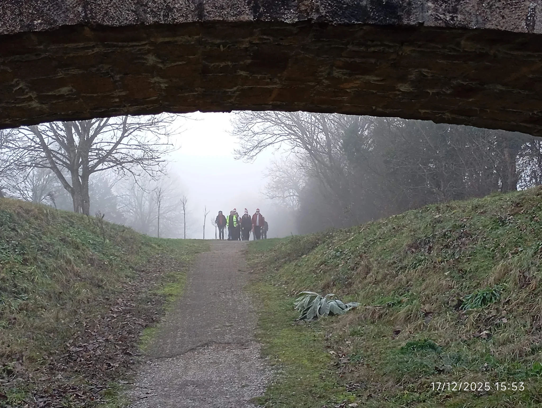 Arrivés à la croisée des voies romaines notre responsable nous propose une option de 1km supplémentaire. Étant donné qu’il n’y a plus de difficultés et que le soleil est toujours là, nous n’avons pas voulu contrarier le responsable et bon gré malgré tout le monde a choisi l’option. Le déplacement s’est fait dans la bonne humeur avec l’échange de recettes pour les fêtes. Malheureusement le brouillard nous rejoint à grands pas et nous enveloppe de son coton.