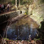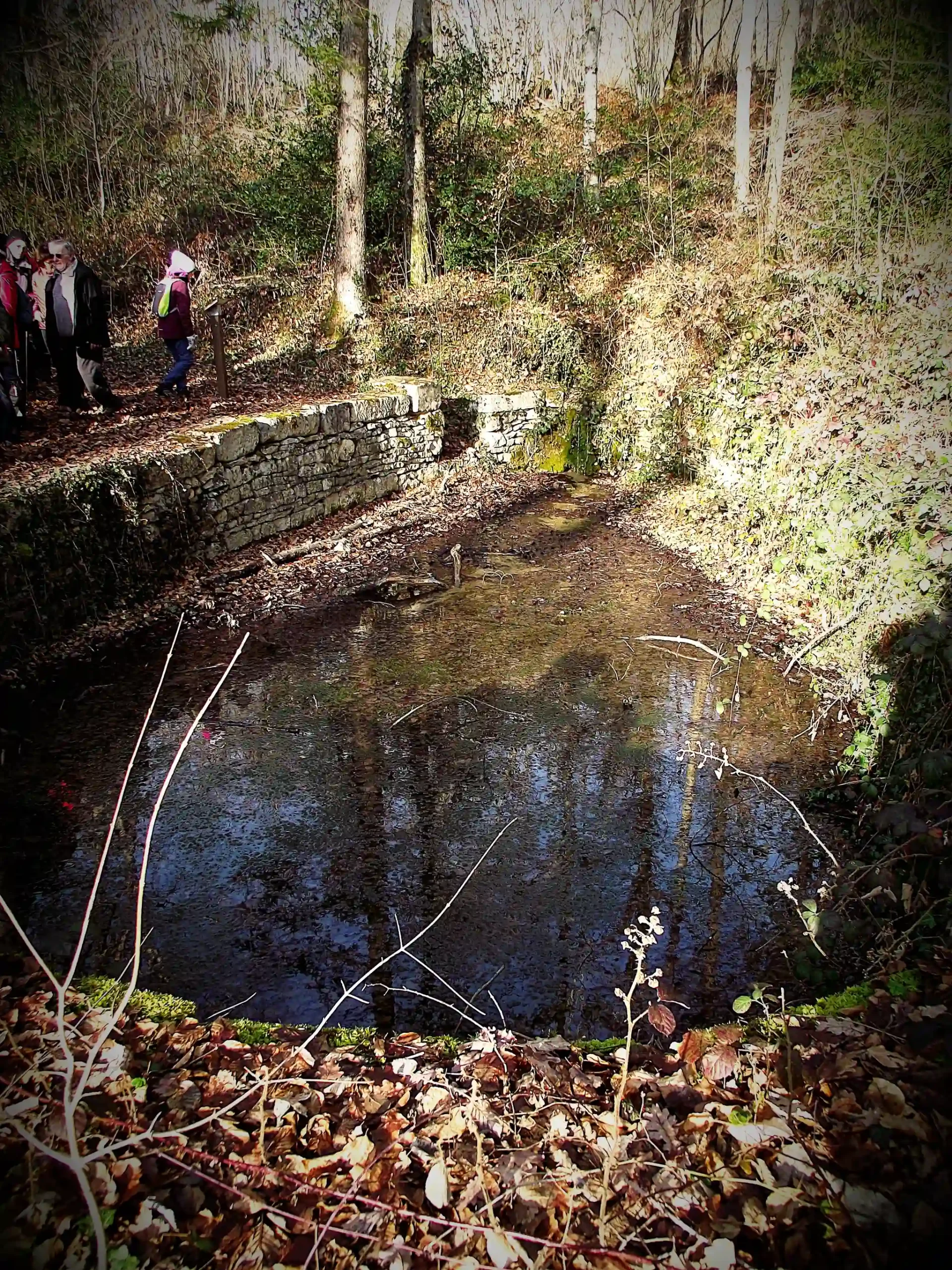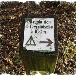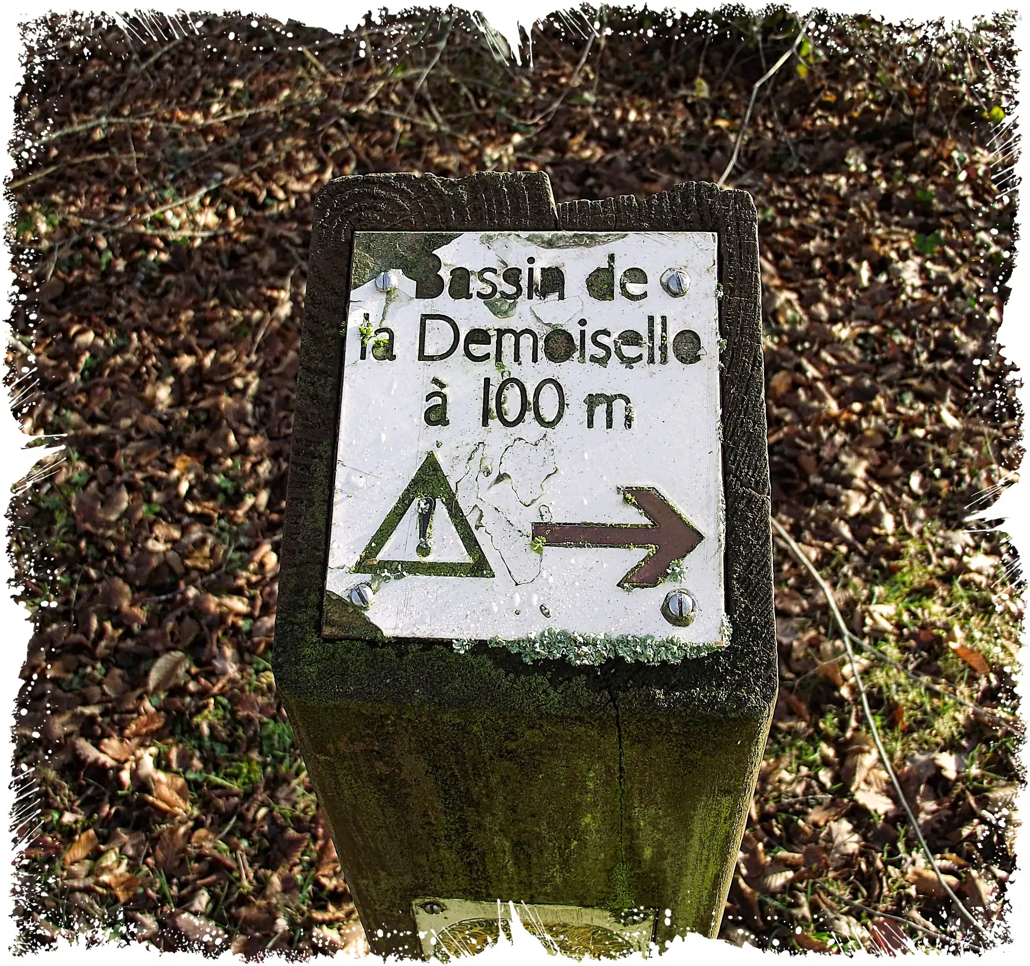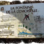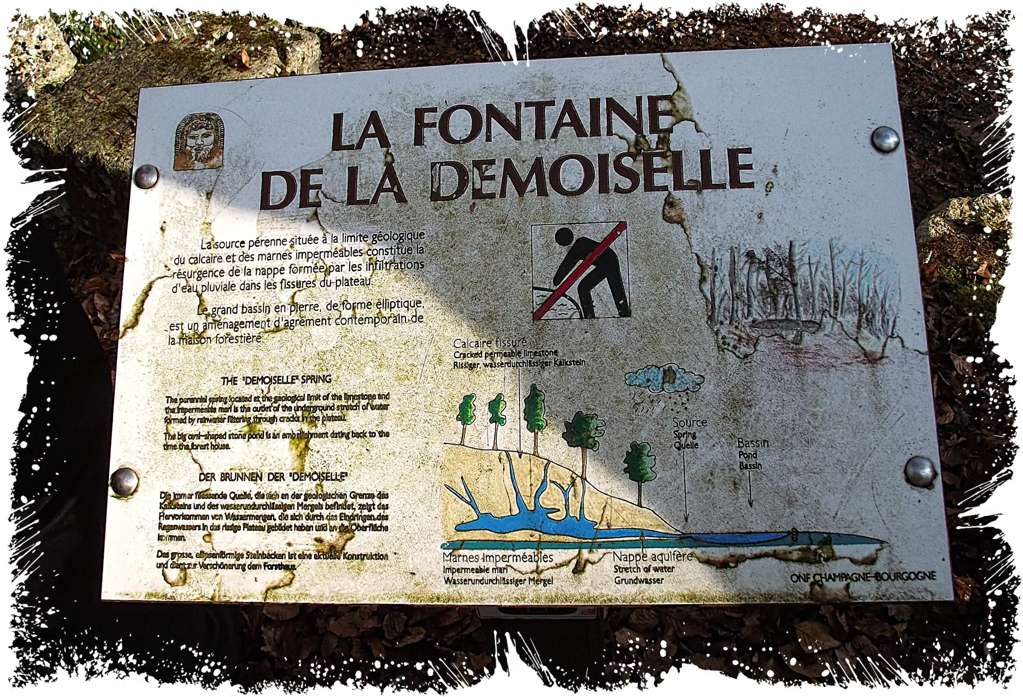 La fontaine de la Demoiselle est proche de la voie romaine. Elle a déjà été utilisée à l’époque antique, car elle constituait un point d’eau important pour faire boire les chevaux et les bœufs avant de commencer à gravir la pente. On ne connaît pas exactement l’origine de son appellation mais on peut formuler deux hypothèses : désignation de la personne qui habitait la maison forestière ou nom d’un insecte proche de la libellule, en plus petit. Personnellement je pencherais plus pour une demoiselle (personnage féminin imaginaire), doté de pouvoirs magiques, et censé influer sur le monde des vivants. L’eau qui jaillit est pure, son débit est variable mais sans interruption durant toute l’année. Le grand bassin en pierre, en forme de poire, est un aménagement d’agrément contemporain de la maison forestière située plus haut.