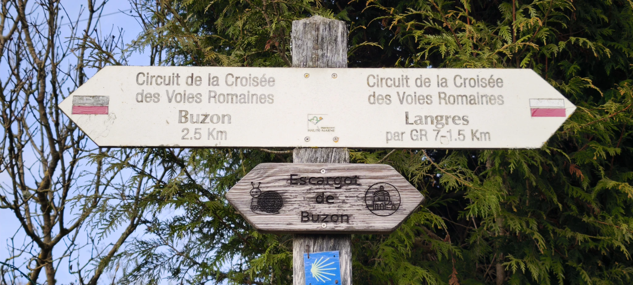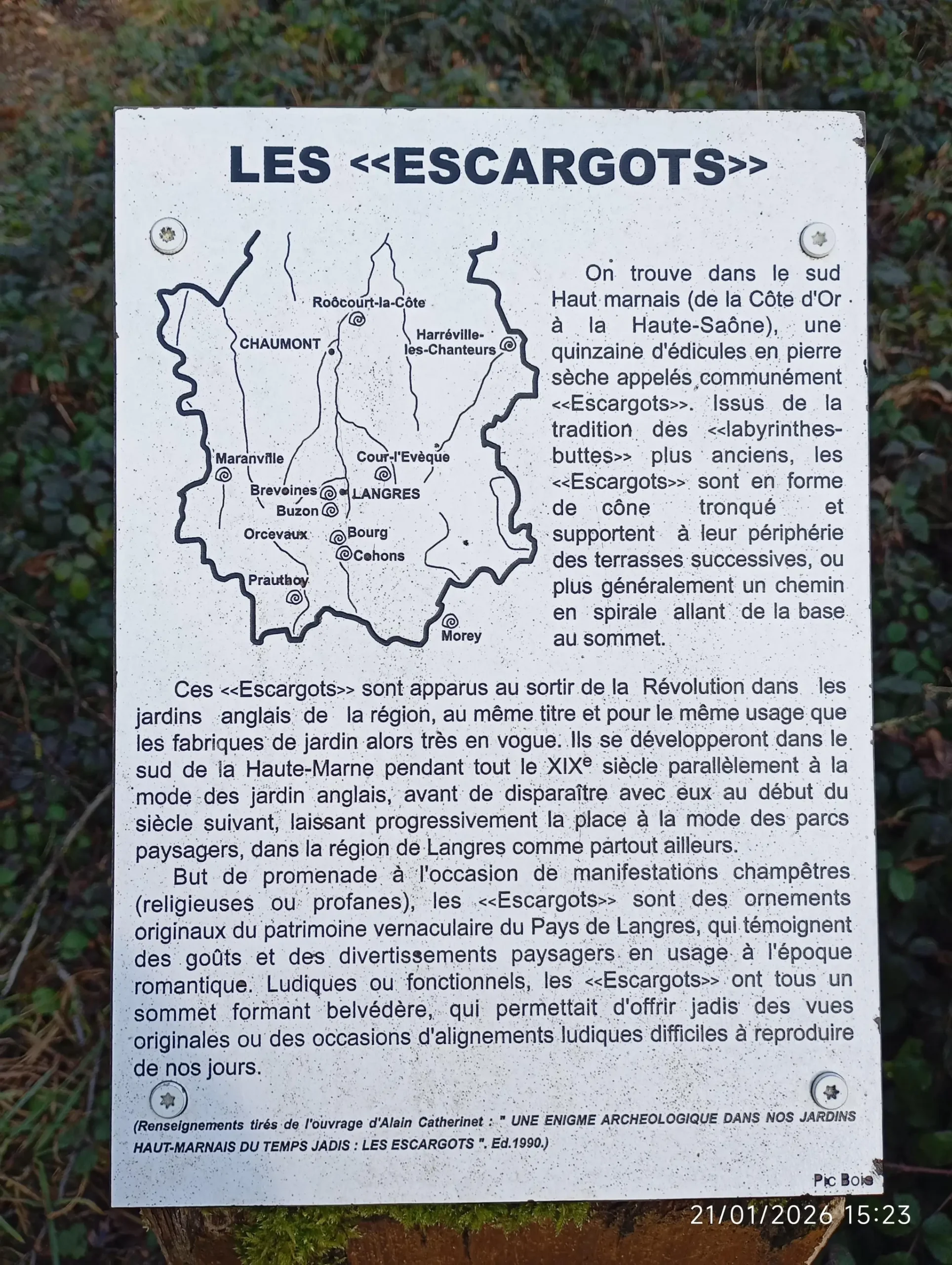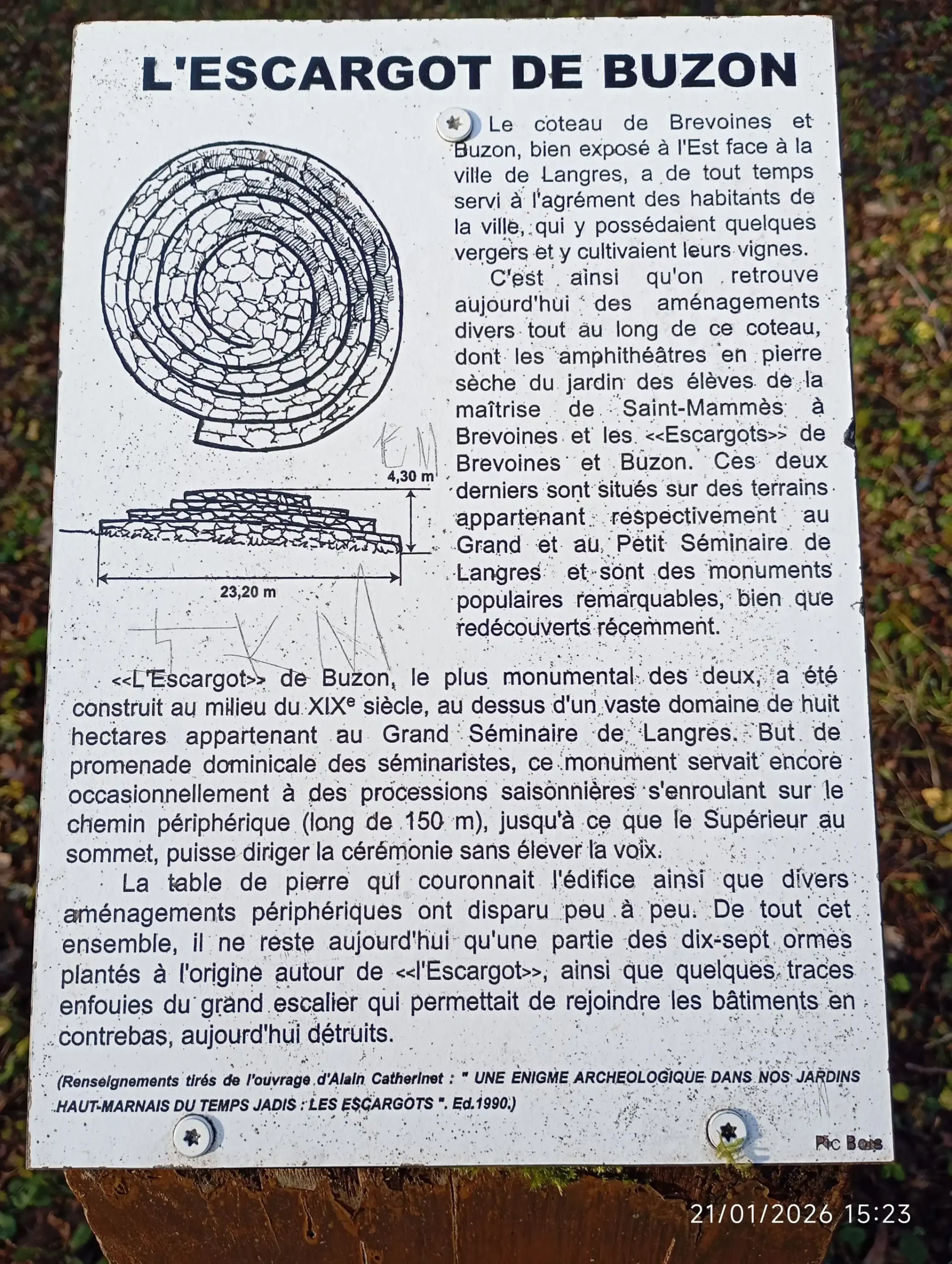 Au-dessus du faubourg de Buzon nous visitons l’escargot construit au milieu du XIXème siècle. Une quinzaine d’édicules ont été édifiés dans le sud Haut -Marnais et nord côte d’or. Structures construites en pierres sèches de forme tronquée dont le chemin qui atteint le sommet est en spirale. L’escargot de Buzon à un diamètre à la base de 23,20m pour une hauteur de 4,30m. Le débroussaillage de cette zone il y a quelques années a permis de remettre celui-ci en évidence et mérite le détour.