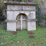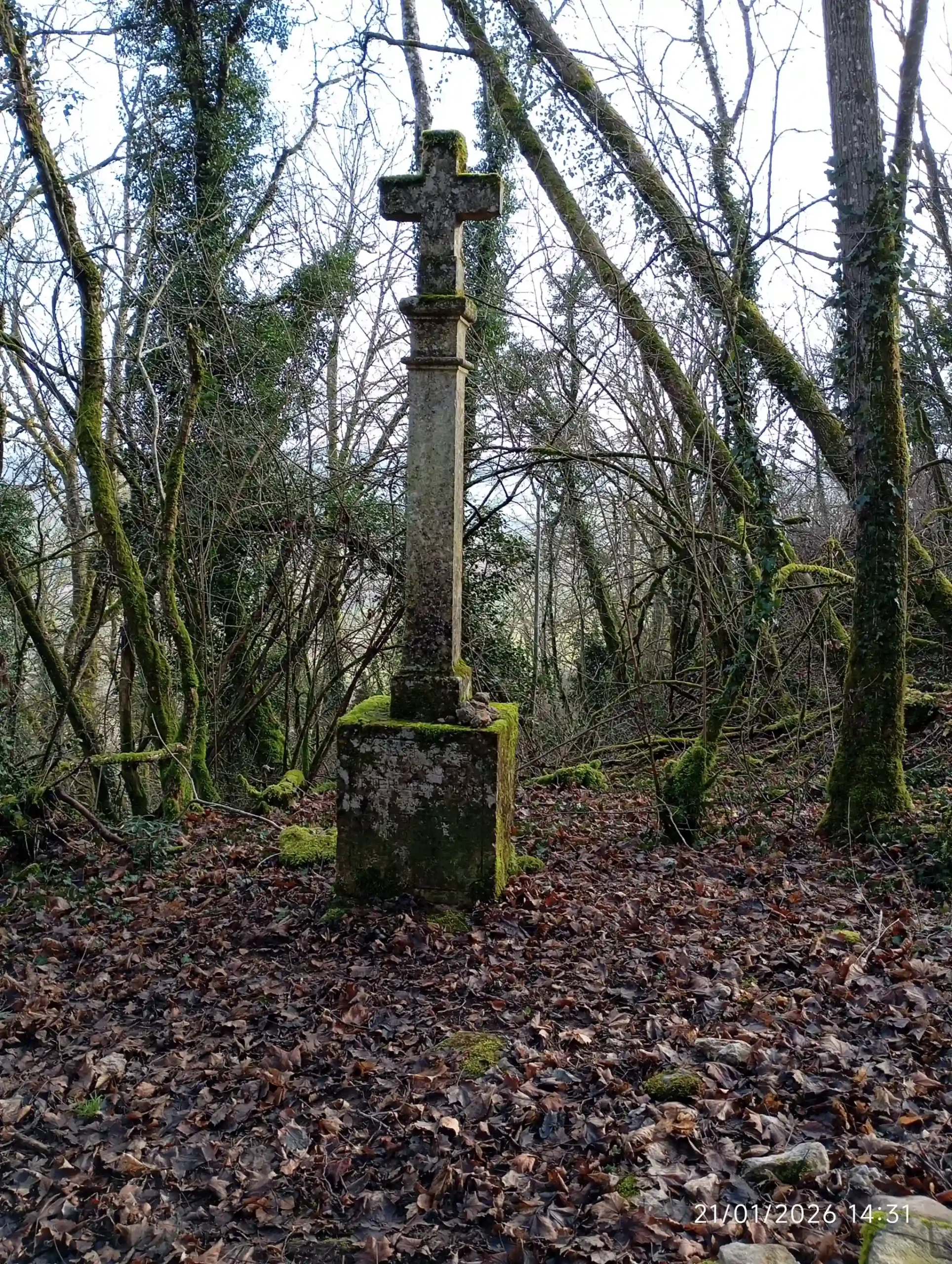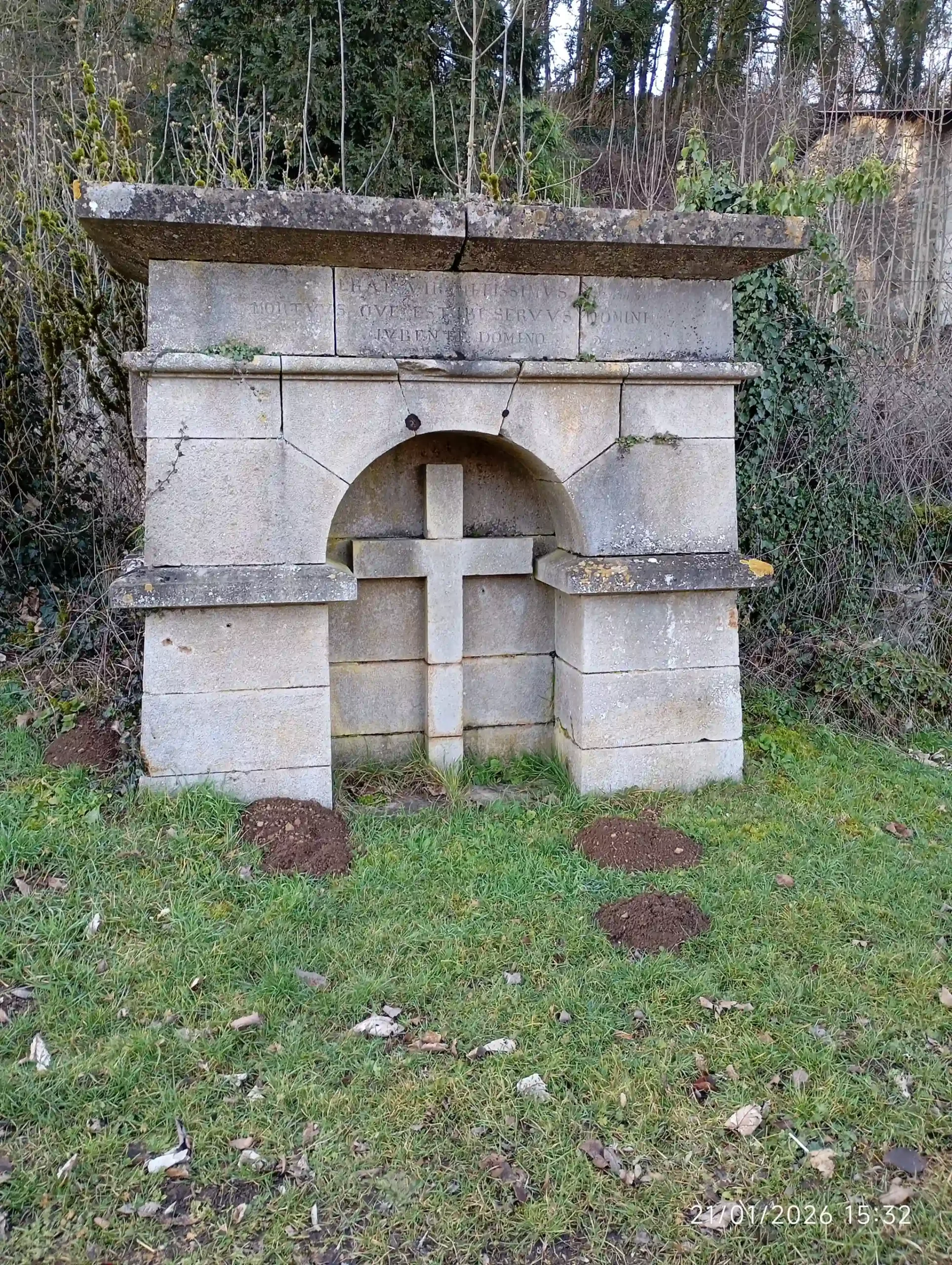 Pour Dominique B. traduction du texte latin qui figure sur le monument érigé au-dessus d’une croix : « erat vir vvutissinud va bien mortuus ove est servus domini juben de domino » : C’était un homme des plus vertueux et il est mort en paix il est le serviteur du seigneur commandement du maître.