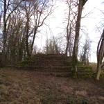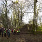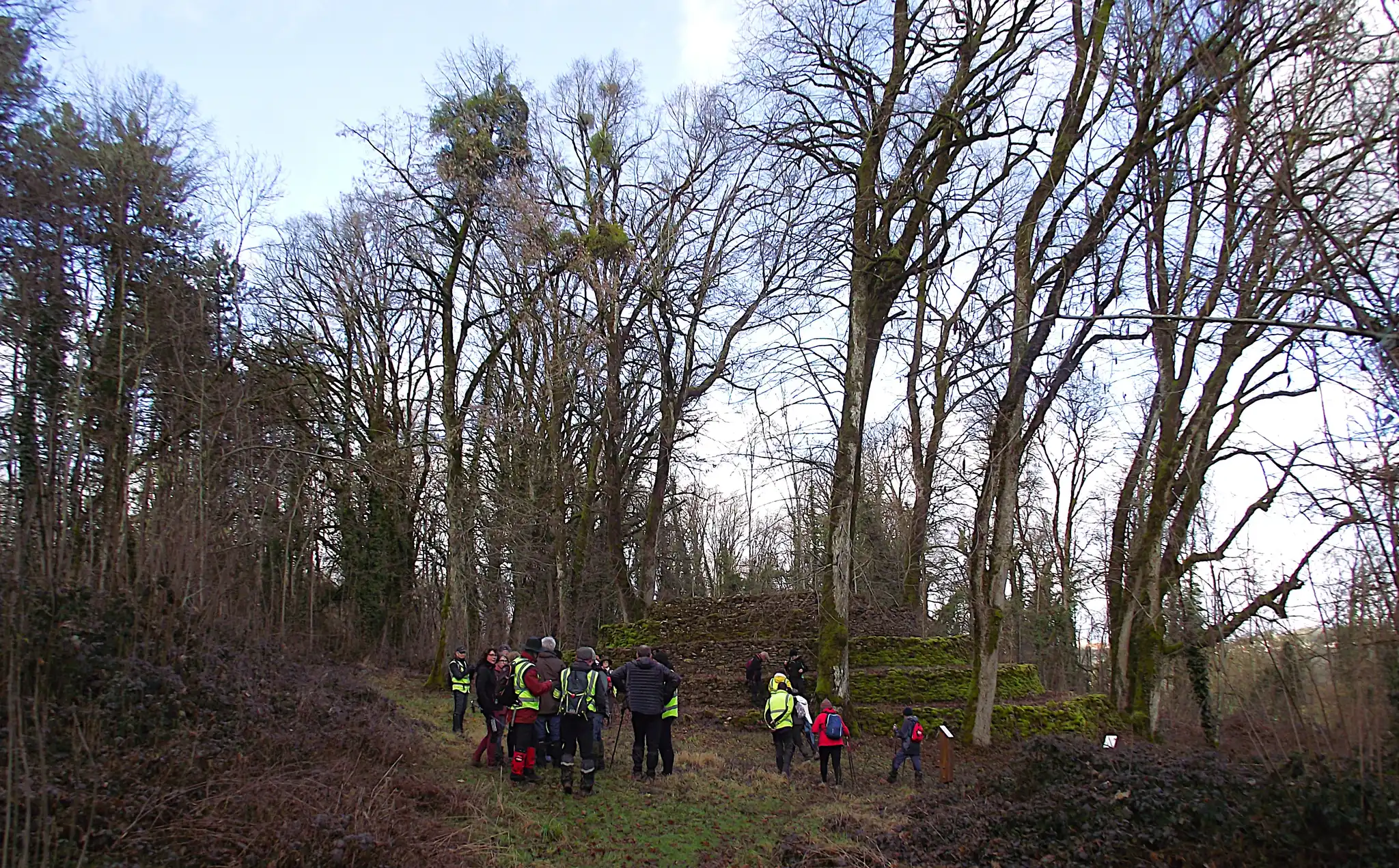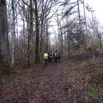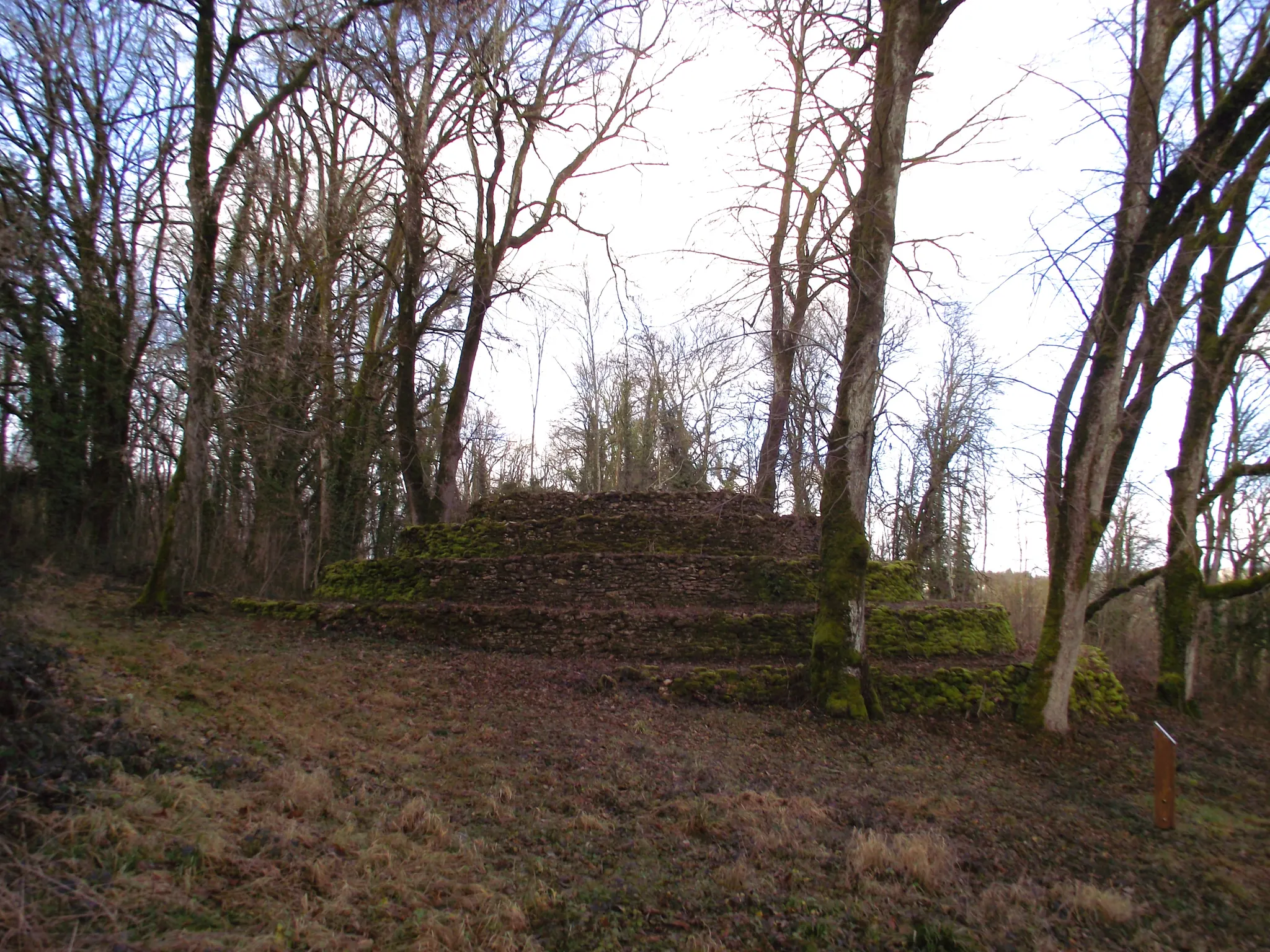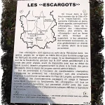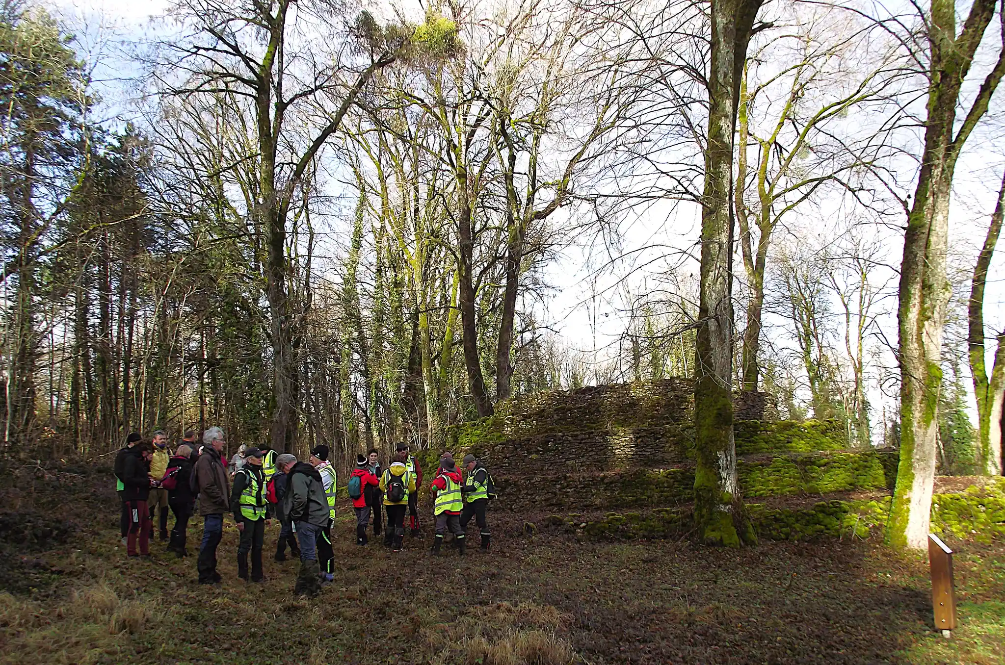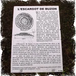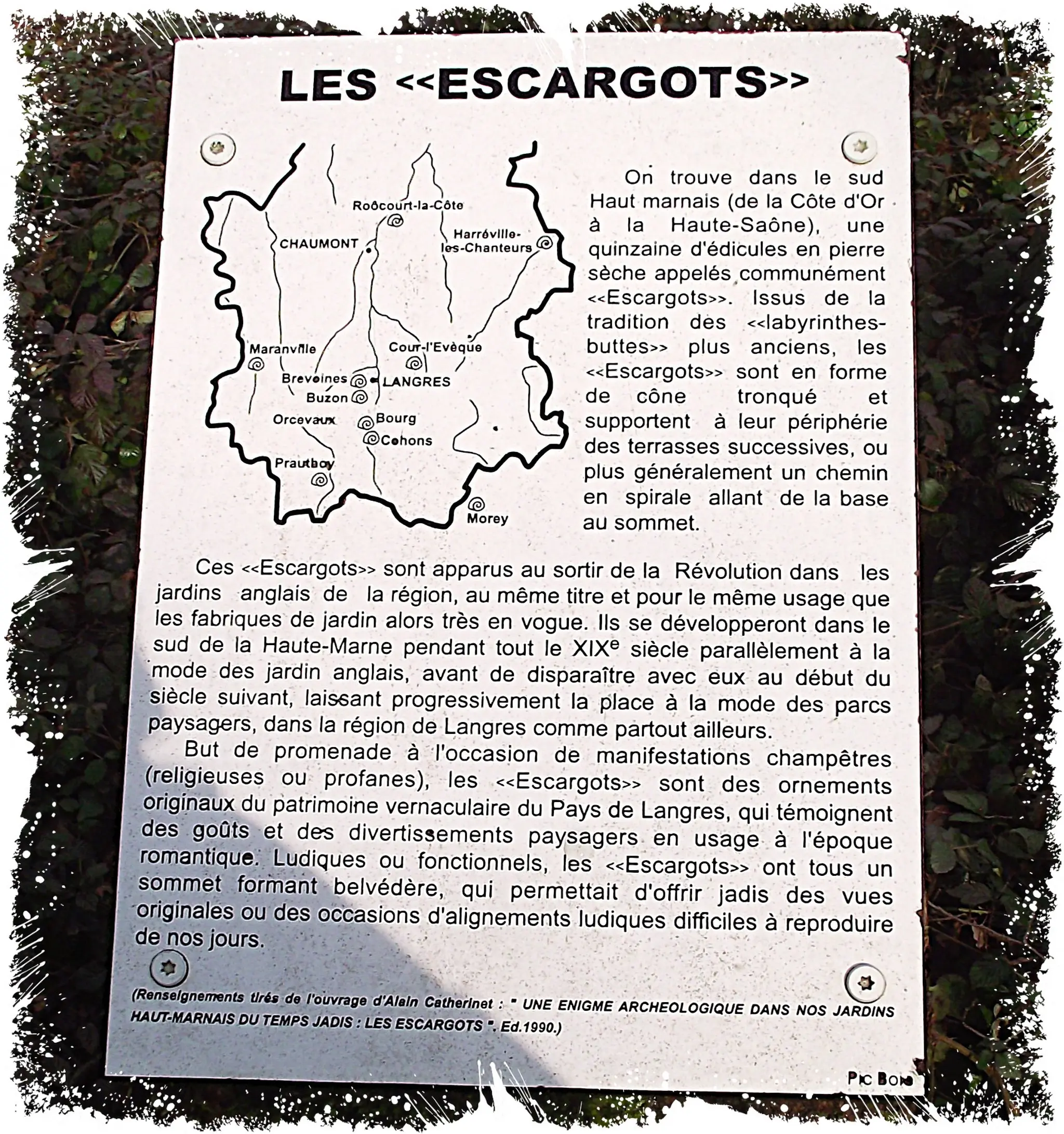 Un détour s’imposait pour visiter l’escargot de Buzon. Avant nous, les marcheurs « champêtres » l’avaient visité le 21 janvier dernier, (voir les commentaires d’Alain S. sur le blog), Ce tertre édifié par les séminaristes de Langres à la fin du 19e siècle servait occasionnellement à des processions saisonnières. Les fidèles s’installaient sur le chemin périphérique en spirale formant terrasse, long de 150 mètres, jusqu’à la plateforme sommitale. Au sommet le « Supérieur » dirigeait la cérémonie sans élever la voix, en raison de la dispersion sphérique naturelle du son de sa voix dans l’air environnent. La table de pierre qui couronnait l’édifice ainsi que divers aménagements installés en périphérie ont peu à peu disparu. Les ormes qui ont été plantés en bordure à cette même époque sont toujours bien vivants.
