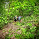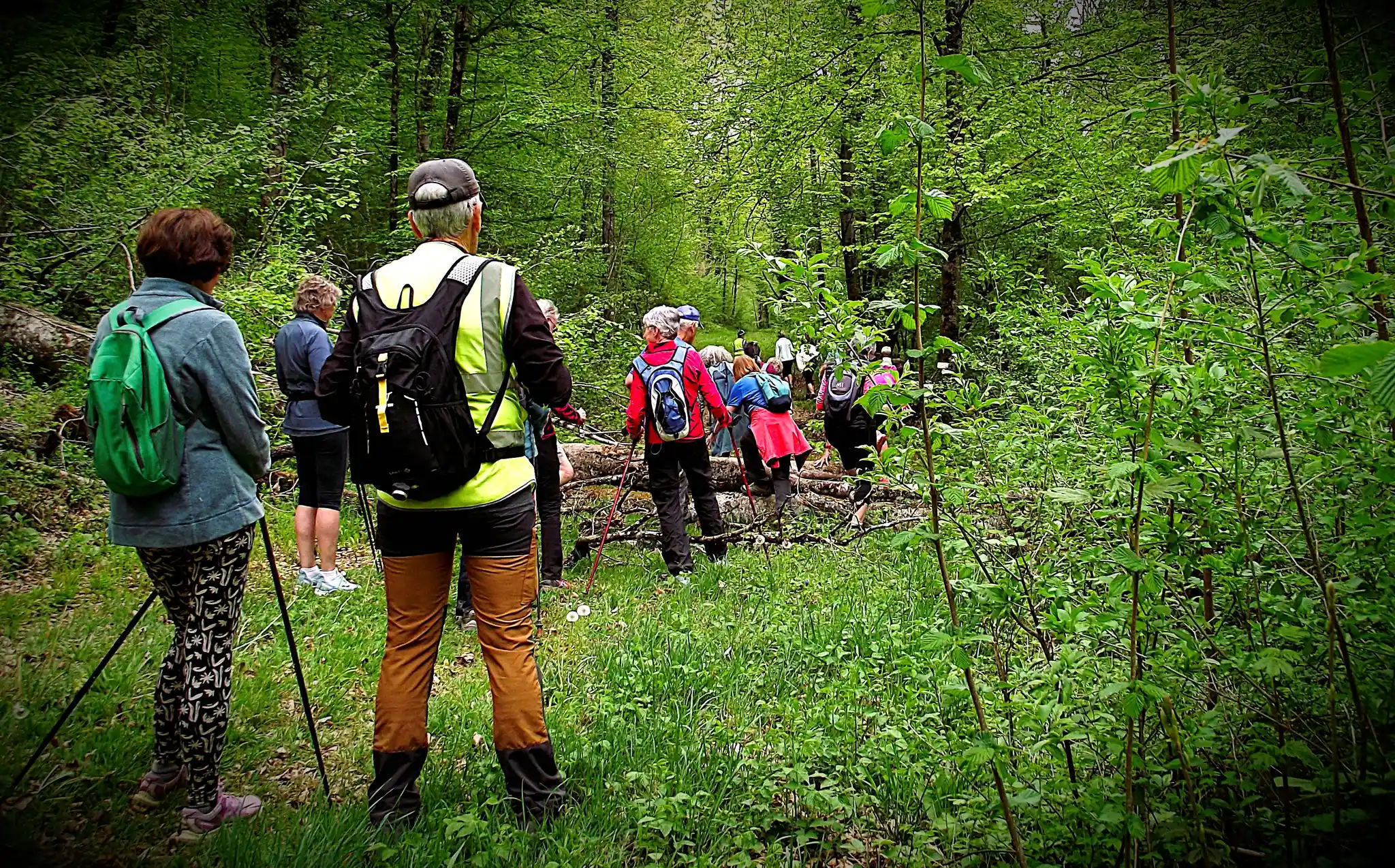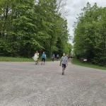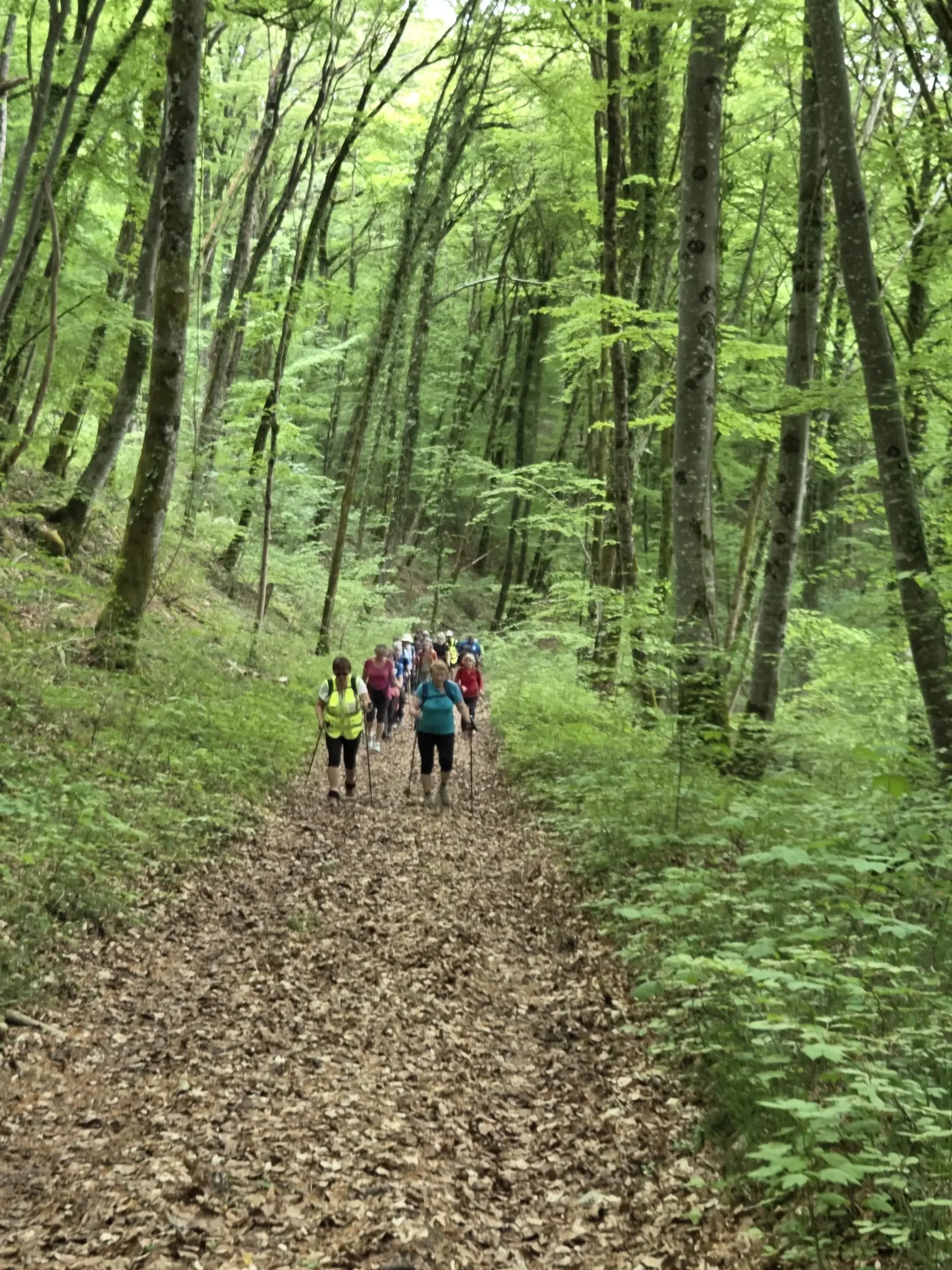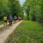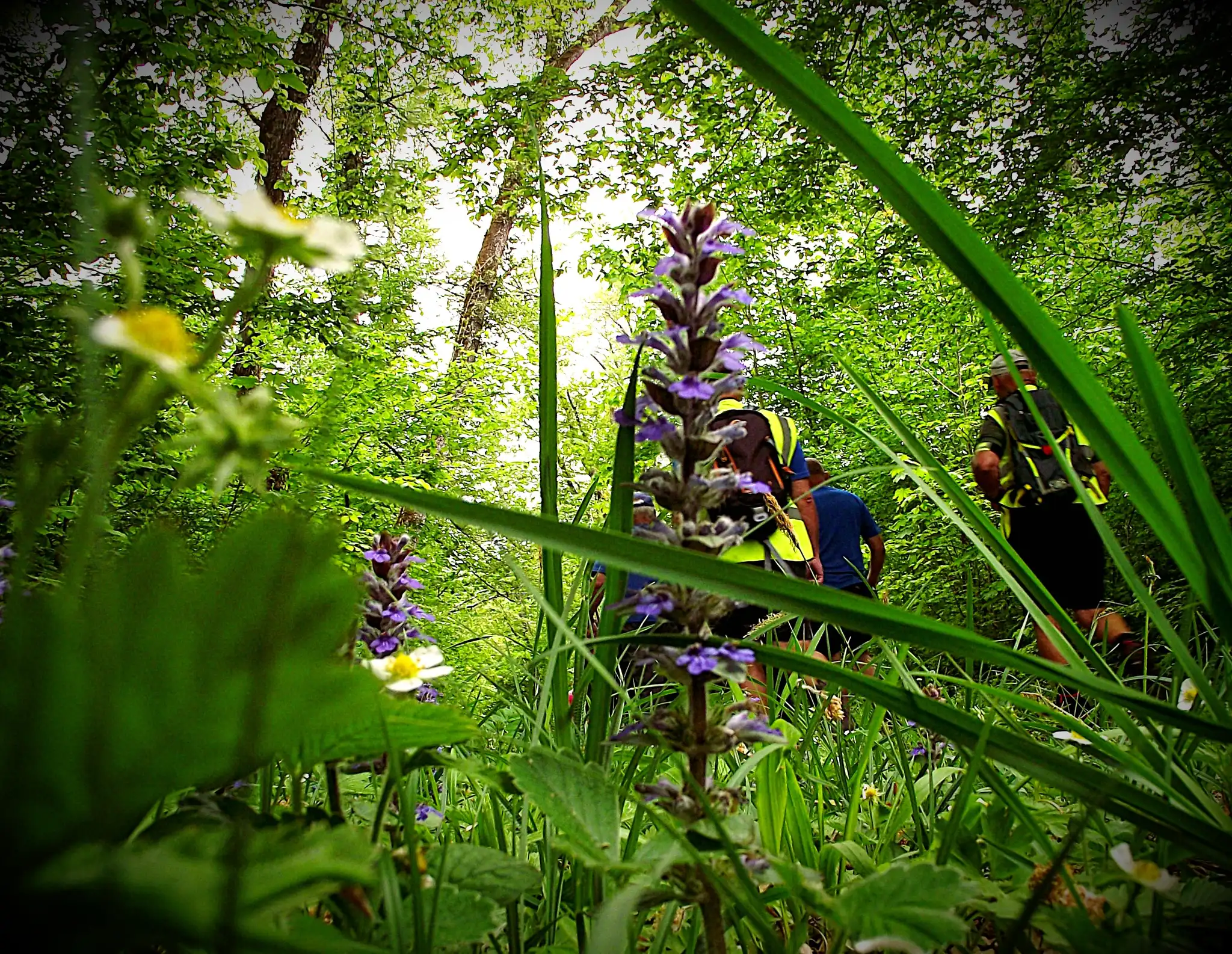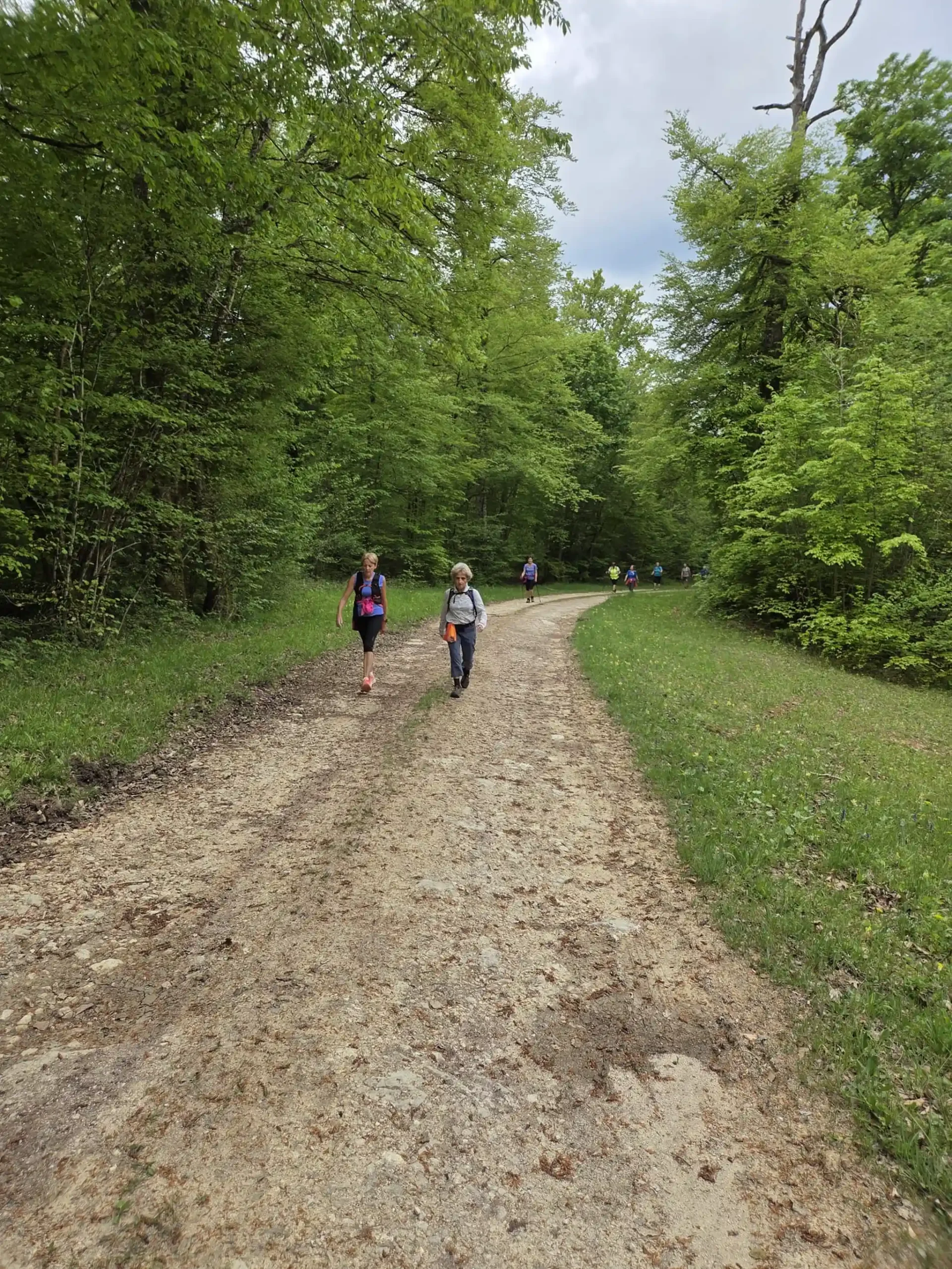 Le ciel, voilé et discret, accompagne la marche sans jamais l’alourdir. Dans cette lumière douce, les silhouettes avancent d’un même élan, portées par un rythme soutenu et régulier. Les montées réveillent le souffle, les descentes l’apaisent, et la forêt enveloppe le groupe d’un calme feutré.
