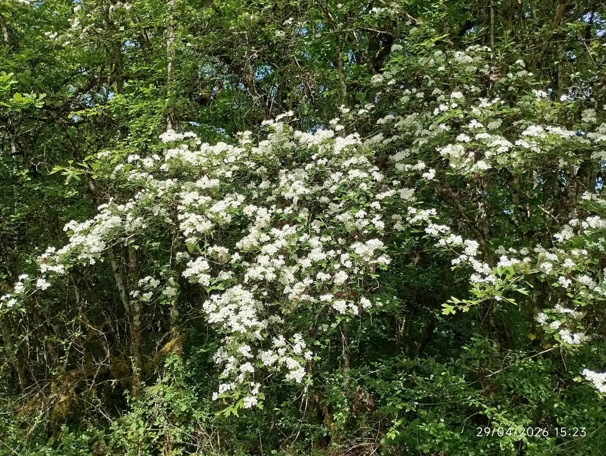 L’aubépine est en fleur, ce sont des buissons entiers qui se sont bardés de fleurs blanches. En langage des fleurs : l’aubépine est symbole de pureté, de l’innocence et de la renaissance. Je pense que notre groupe est le tout à la fois : pur, innocent et se renaît toutes les semaines !!!!!